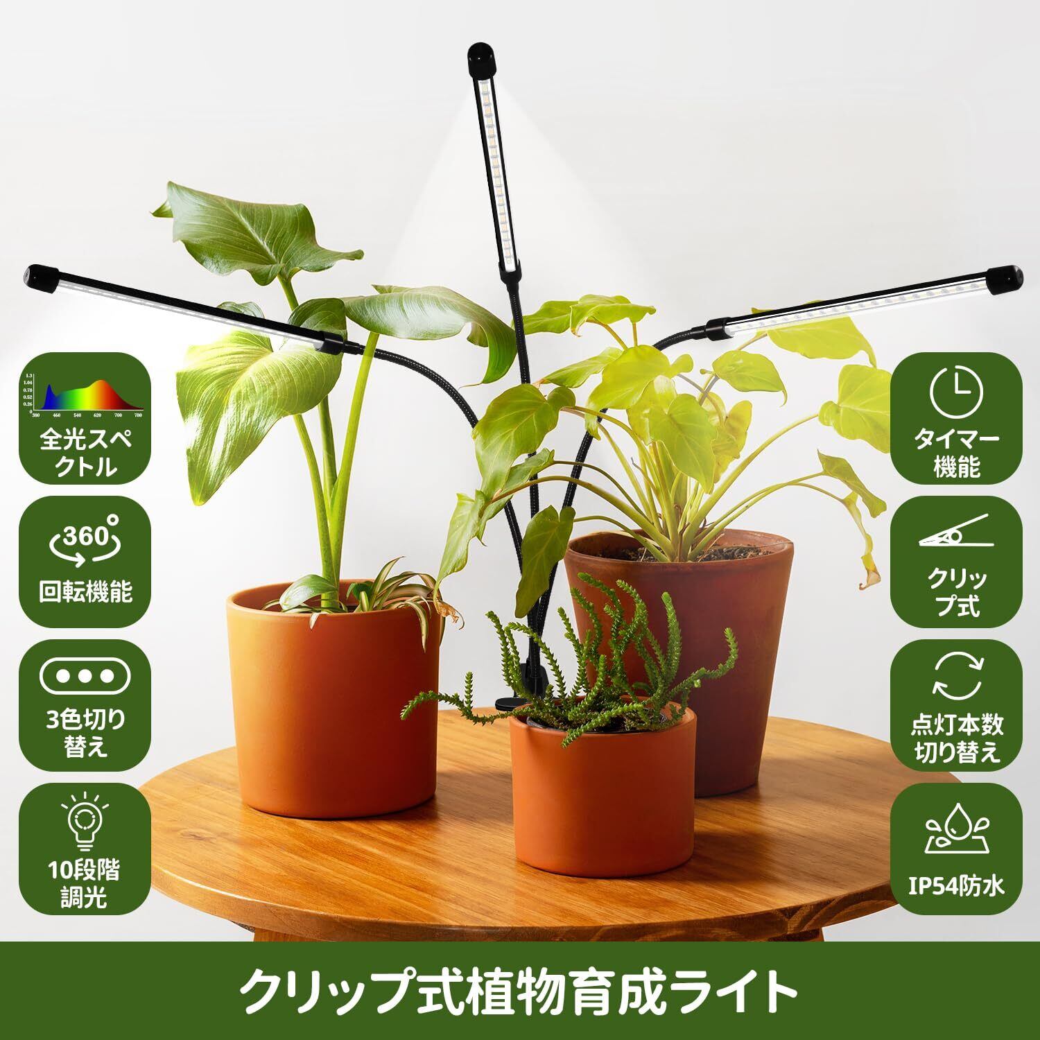 【タイマー機能・記憶機能】クリップ式の育成ライトは使用上にもっと便利です。タイマー機能:4H・8H・12Hの3モードで、電源が切らなければ毎日循環して自動点灯します。記憶機能:任意の点灯モードでスイッチオフ、再びスイッチオンにすれば同じギアのままです。点灯ヘッドの切り替え機能:任意点灯モードでヘッド切り替えボタンを押すと点灯ヘッドを切り替えます。