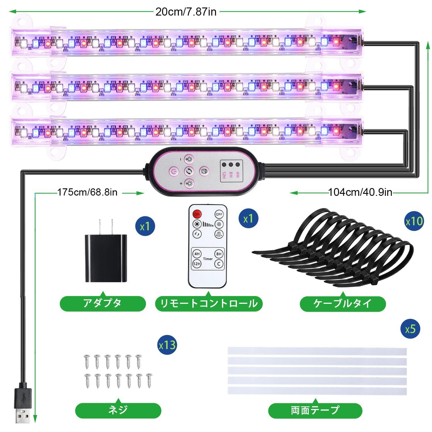 LED植物育成ライト、フルスペクトル植物ランプ、3/9/12Hタイマー、10段階調光、室内栽培用、家庭菜園、水耕栽培、日照不足解消、植物成長促進、3ヘッド20cm赤青黄81LED