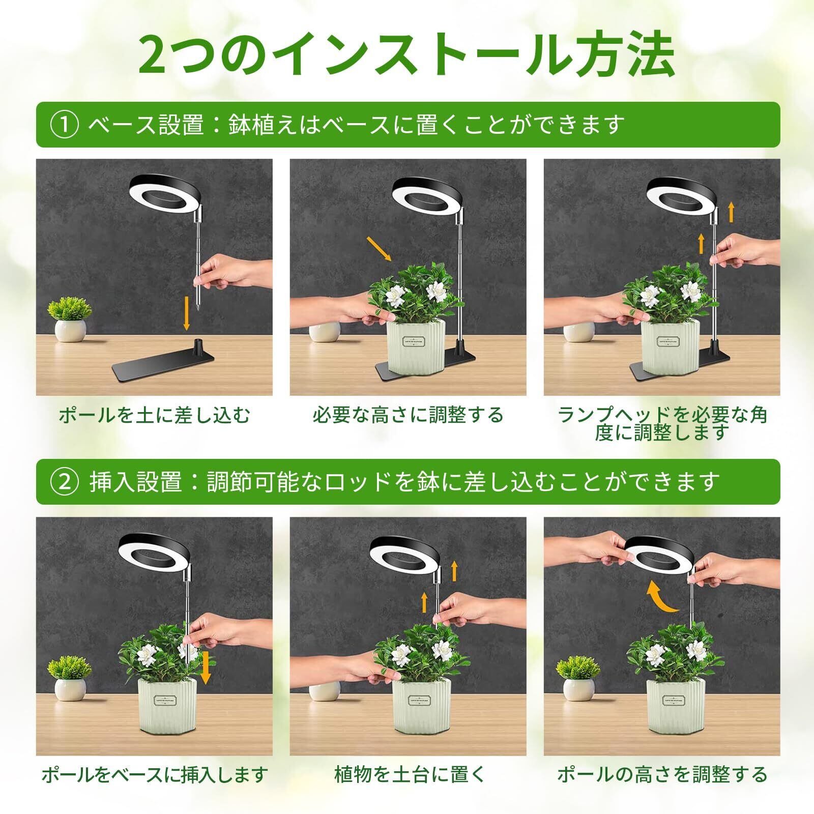 【2つの設置方法・ベース設置/挿入設置】2つの設置方法があります:1.取り外し可能な独立したベース設計、安定性を確保するために植木鉢をベースに置きます。2.調節可能なロッドを鉢植えに挿入し、希望の高さを調整するだけです。いつでもどこでも植物に十分な光を提供し、光の保護下で植物が健全に成長できるようにします。
