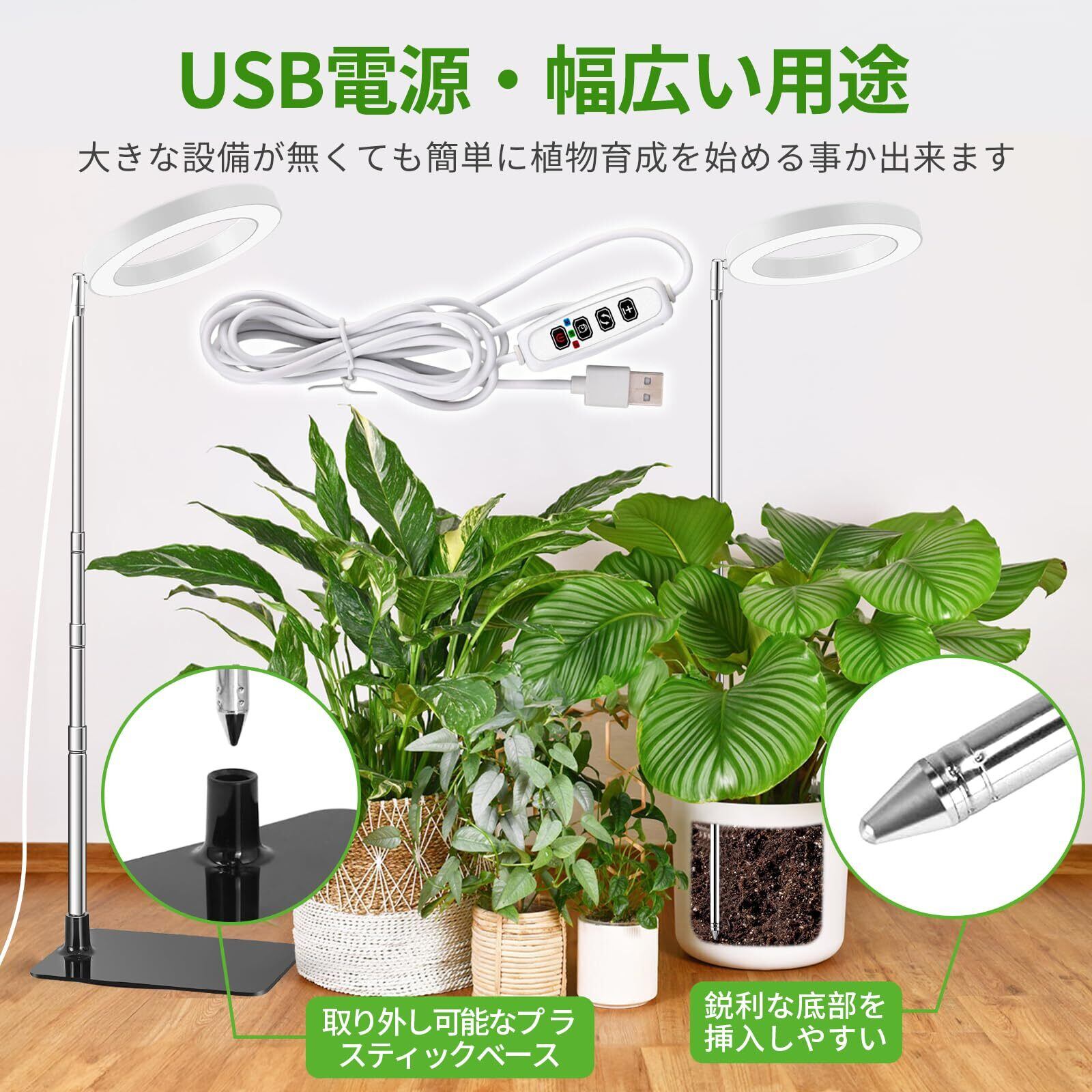 【2つの設置方法・ベース設置/挿入設置】2つの設置方法があります:1.取り外し可能な独立したベース設計、安定性を確保するために植木鉢をベースに置きます。2.調節可能なロッドを鉢植えに挿入し、希望の高さを調整するだけです。いつでもどこでも植物に十分な光を提供し、光の保護下で植物が健全に成長できるようにします。