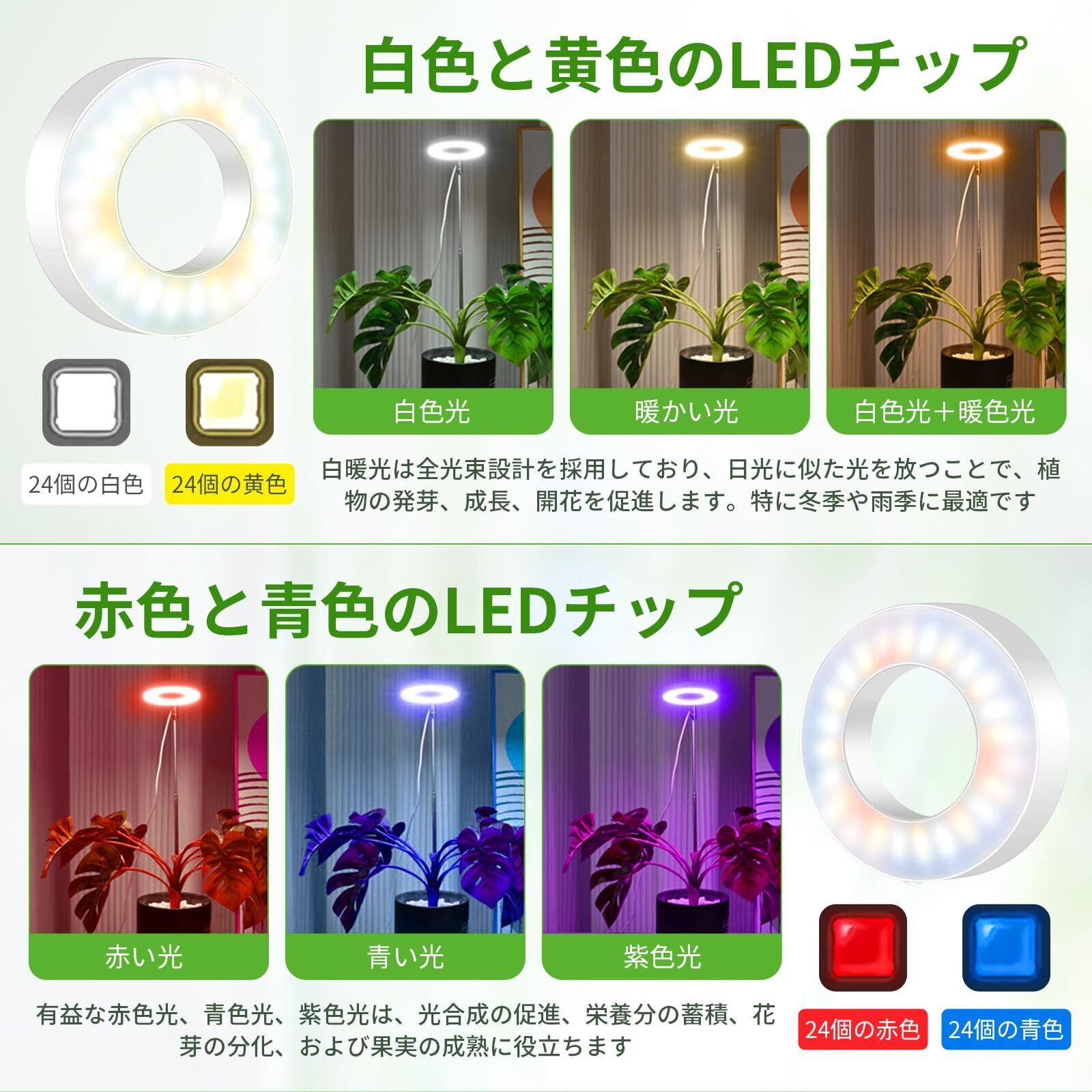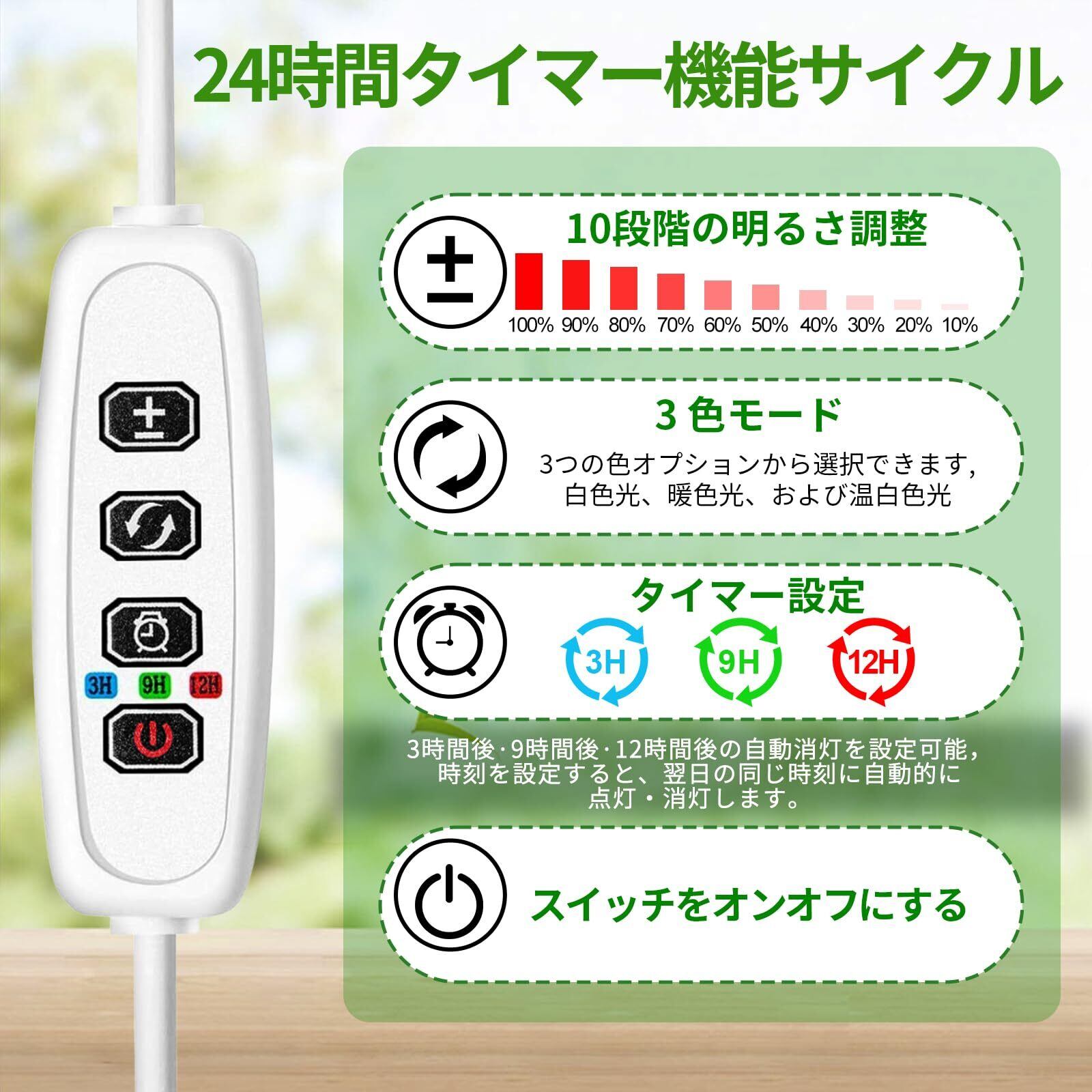 【サイクリック・タイミング機能】植物栽培は3つのループタイマー設定で3/9/12時間、植物による光加減によって異なる時間を設定できます。一度設定でき、毎日自動的にオンとオフになります。 毎日設定する必要はありません。これにより、仕事中や休暇中でも、手作業で植物の世話をする必要がなくなる。注意:充電不可、タイマー機能使用時電源を入れてください。