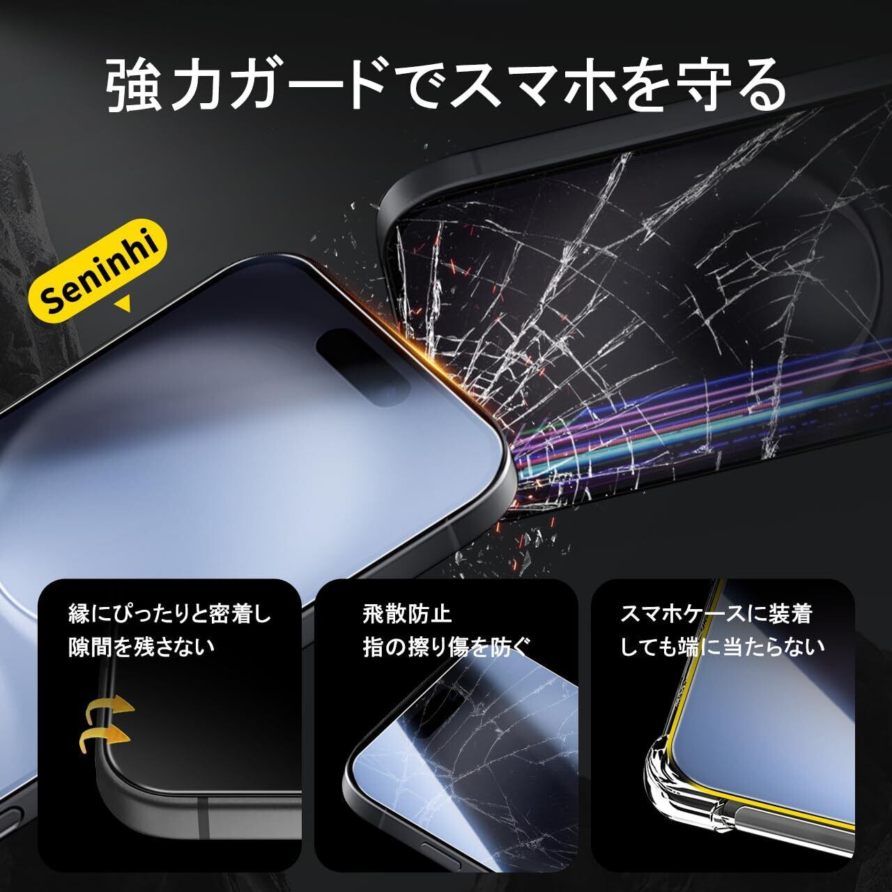【日本旭硝子素材採用!安全安心・飛散防止設計!】 国産ガラス採用、日本旭硝子社製ガラス素材を使用します。9Hの表面硬度を誇る保護フィルムが摩擦や傷から液晶ガラスをしっかり保護します。通常のPETフィルムより6倍の強度、鍵やカッターなどの鋭利な物を当てても損傷なく使用する事が可能。万が一強力な衝撃でガラスフィルムが割れてしまっても、破片の飛び散りを防ぐ飛散防止コート処理で、画面をしっかり保護、スマホ本体と共に手の怪我の心配もありません。日常生活では、スマホを落としたり衝撃を受けたりした時に、保護フィルムがあれば、画面やレンズの破損を気にすることなく、とてもしっかりと保護することができますよね!