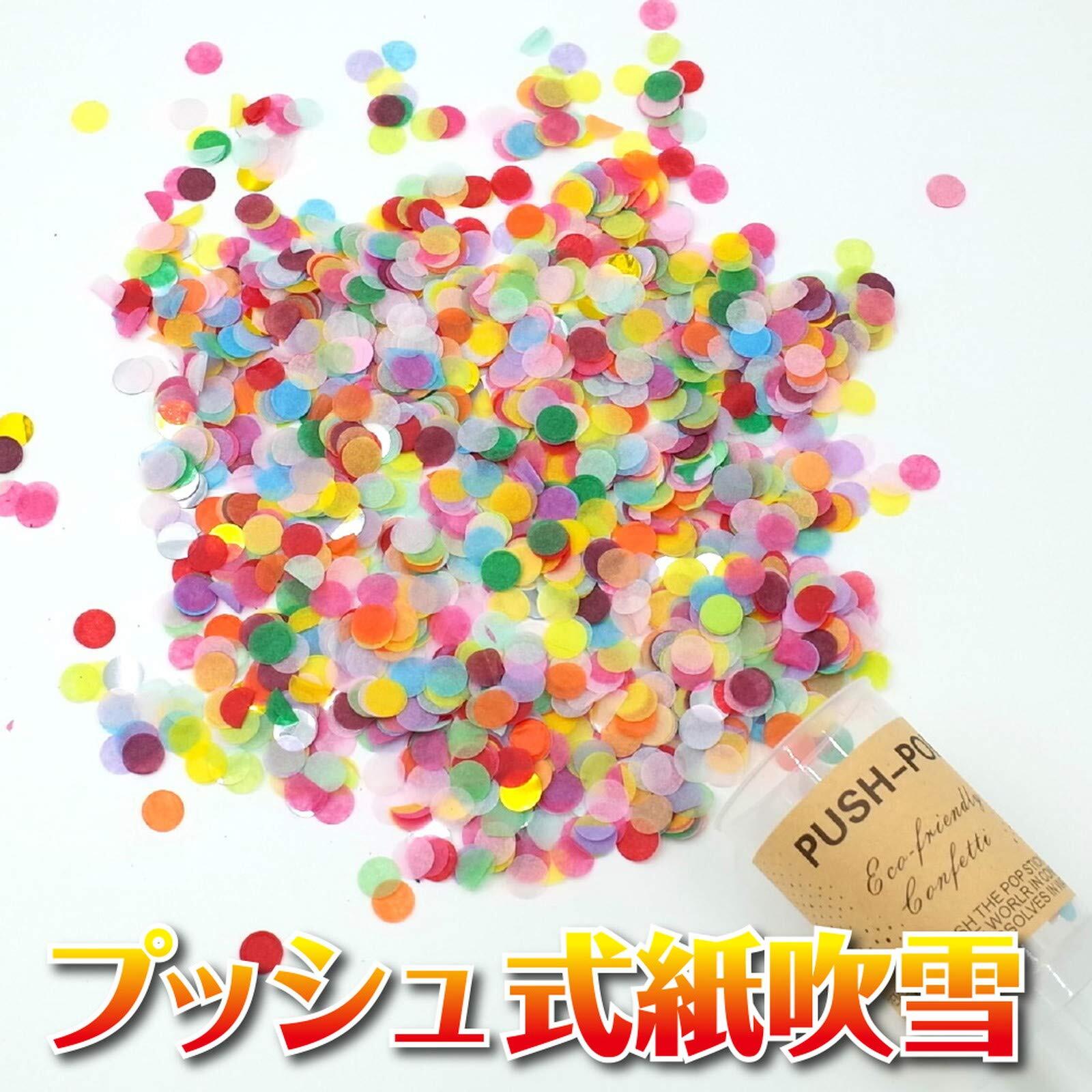 ・プラスチックのプッシュ式ケースにセットされた状態でお届け致します。棒をぐっと押し出して、紙吹雪をふんわり、きれいに押し出すことができます。届いたらすぐに使えるので便利!