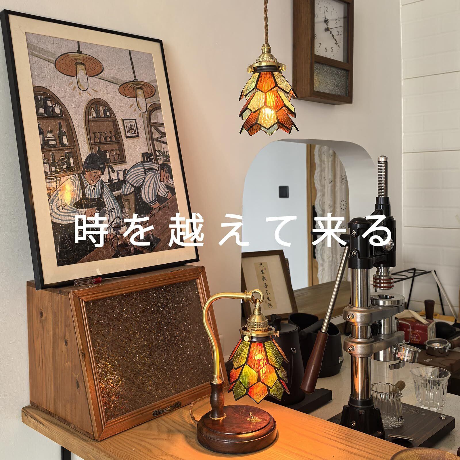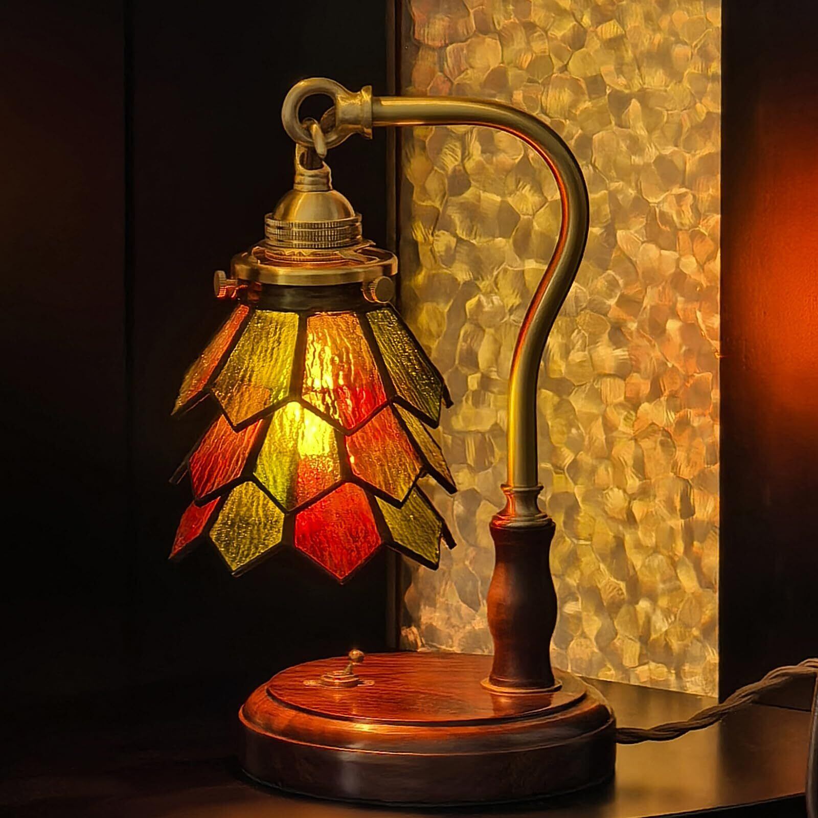 【ステンドグラスシェード】ブラウンとクリアのカラーガラスを松ぼっくりのように重ねたユニークなシェードが特徴です。光を透過すると、ガラスの色と質感が木漏れ日のように柔らかく輝き、アートのような間接照明を生み出す、おしゃれなステンドグラス ランプです
