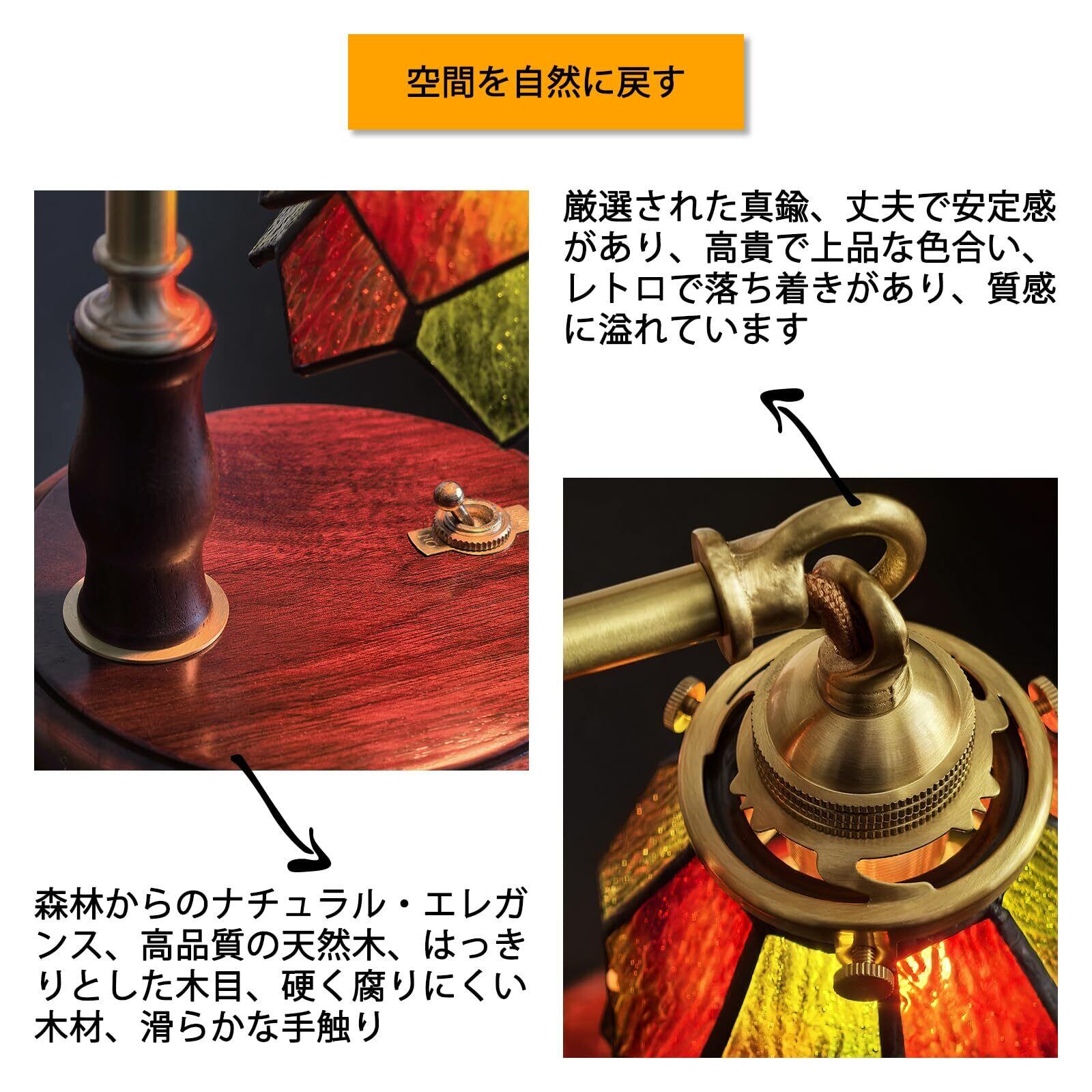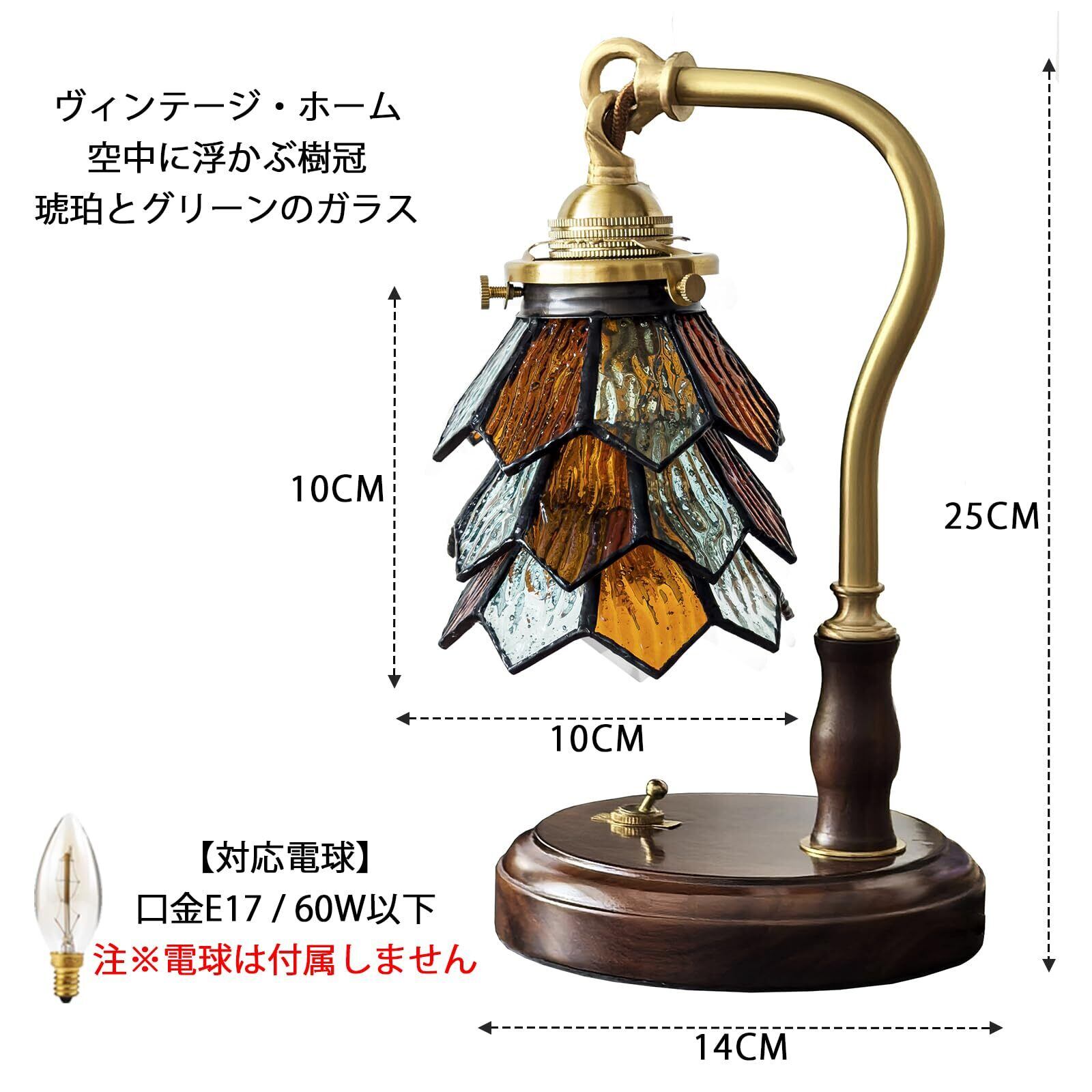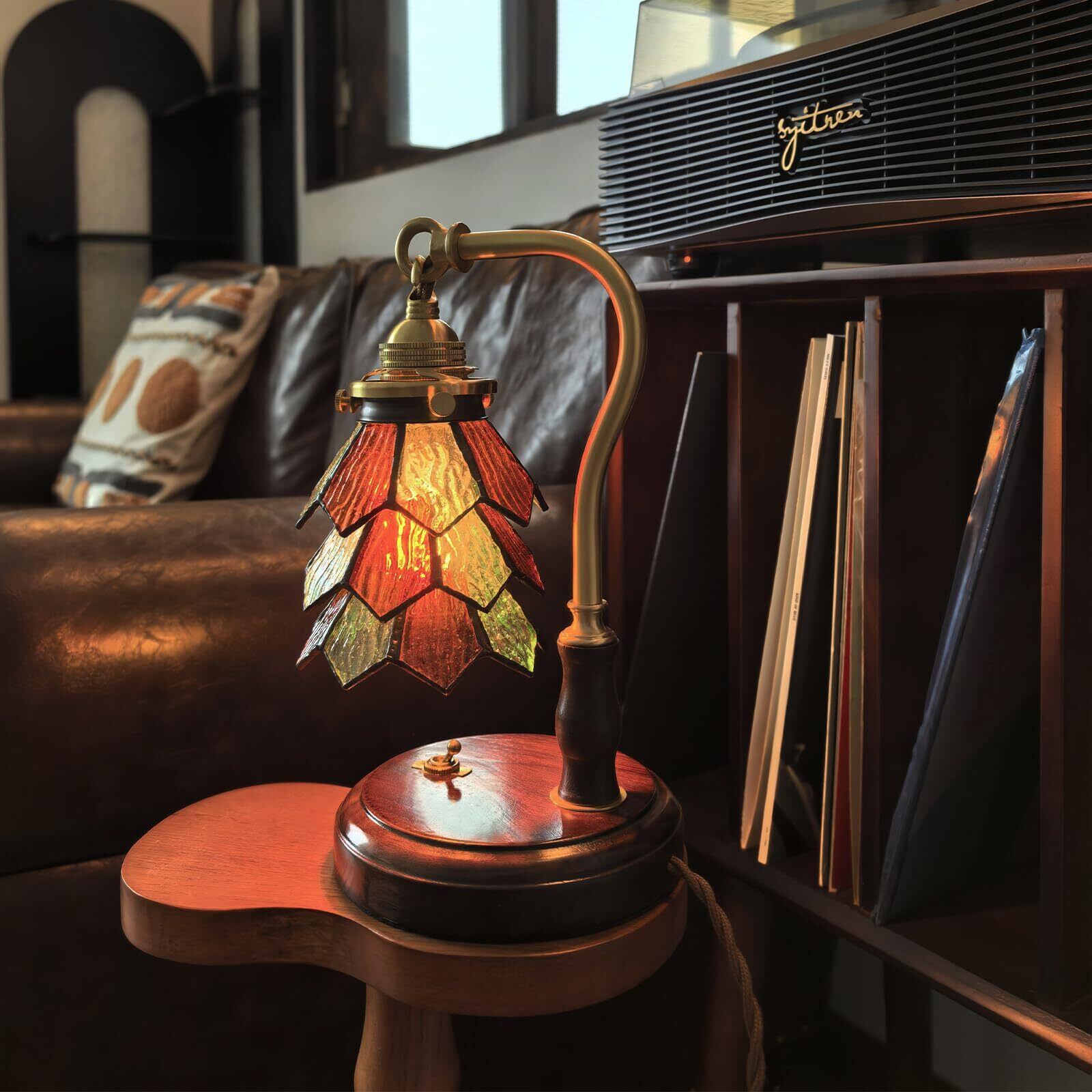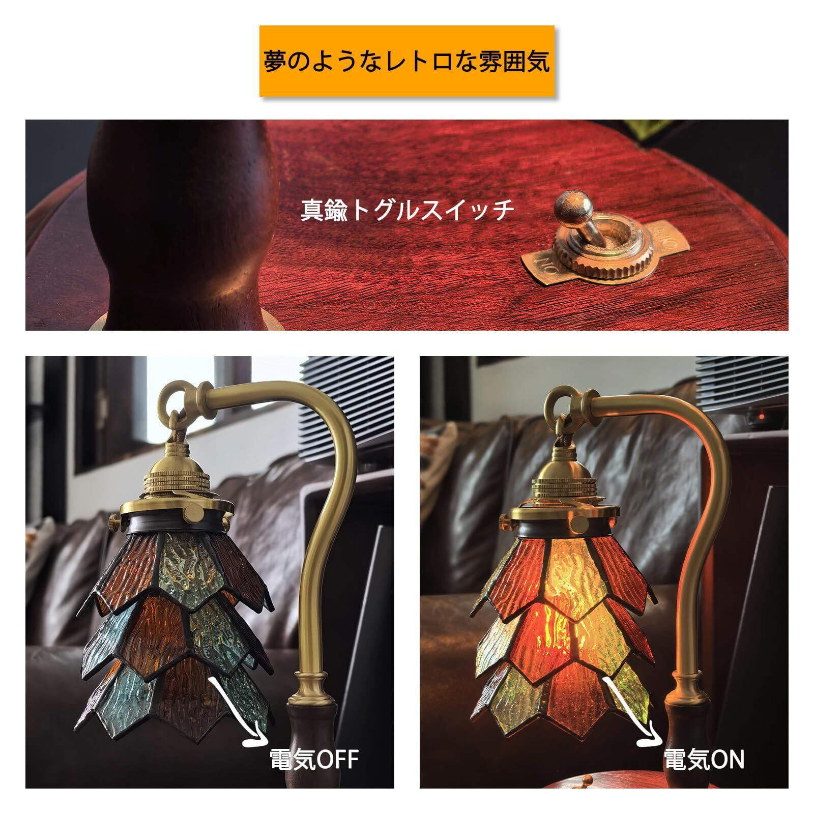 ステンドグラス テーブルランプ おしゃれ ブラウンとクリア 松ぼっくり型シェード 真鍮アーム 木製ベース レトロナチュラル雰囲気 間接照明 E17 口金 LED 対応 ベッドサイドランプ 寝室/書斎/リビング対応 (電球別売)
