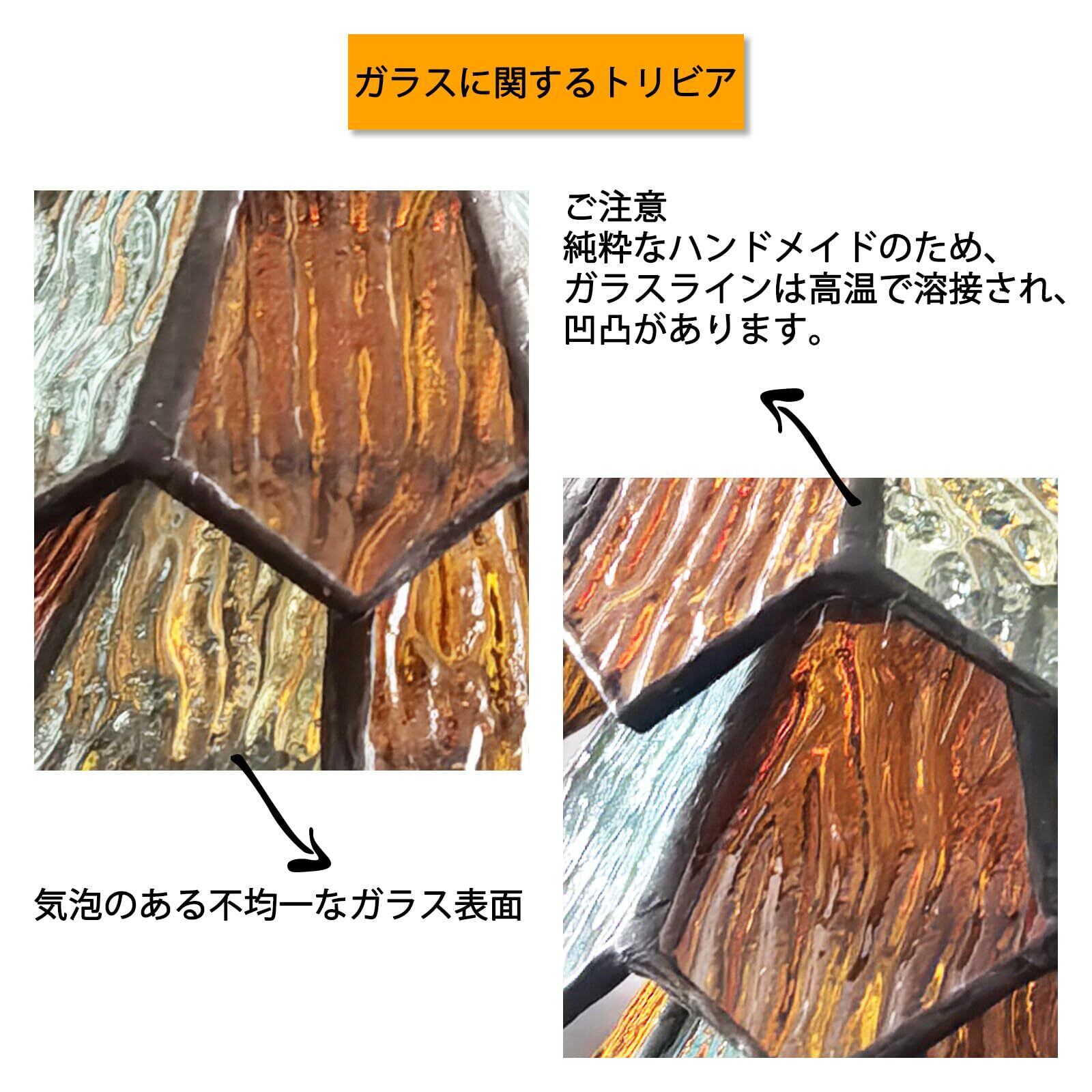 松ぼっくり型ステンドグラスシェード:ブラウンとクリアのカラーガラスを、一枚一枚手作りで重ね合わせたデザイン。光が透過すると、ガラス表面の凹凸が柔らかな影を作り、森の中のような自然な光の演出が可能です。