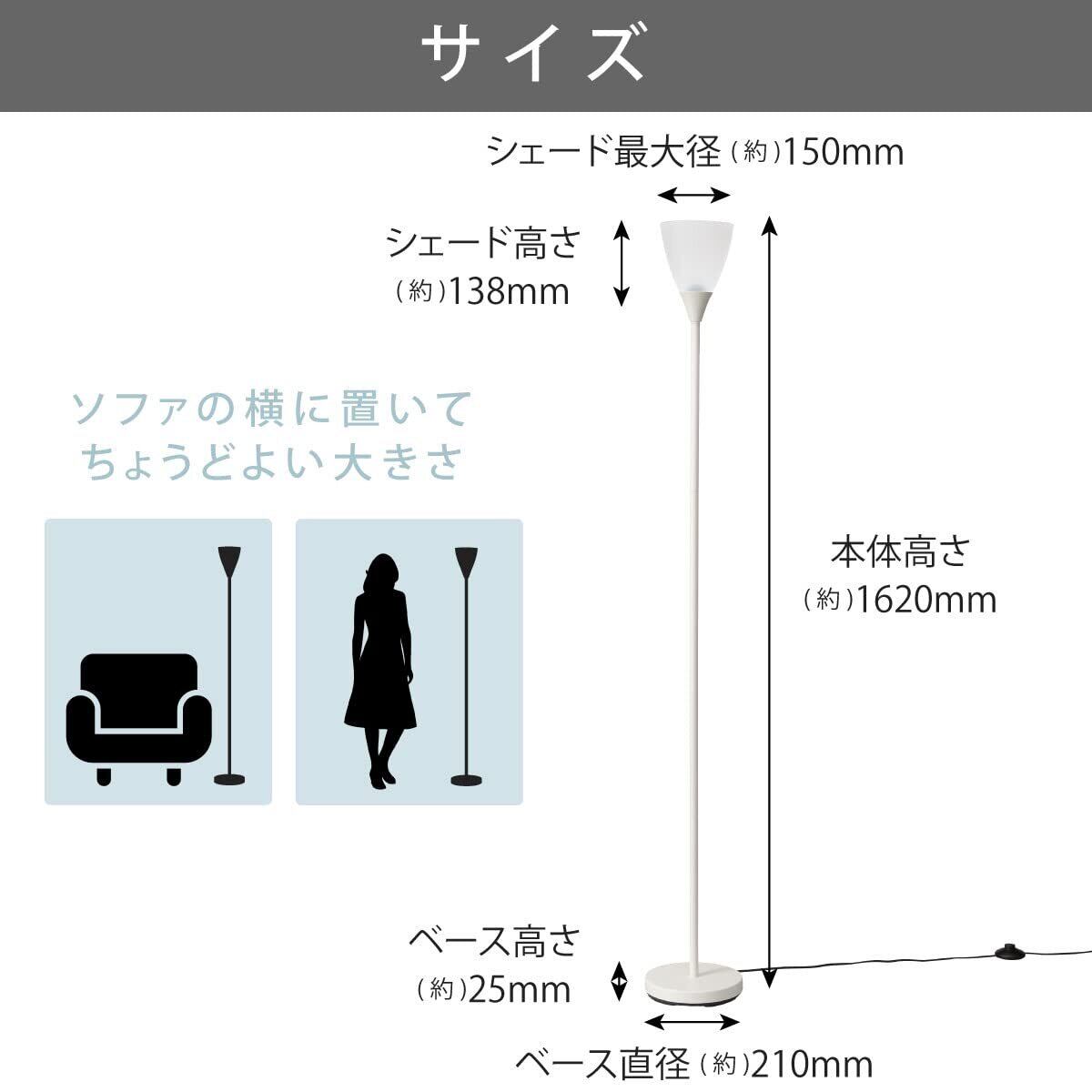 【 特 長 】 ● お部屋の雰囲気づくりに ● 電球別売(適合電球は口金E26) ● カラーはホワイト 【 仕 様 】 ■ スイッチ:フットスイッチ(ON/OFF) ■ 材質:本体…スチール、シェード…プラスチック ■ 本体サイズ:(約)幅210×高さ1620×奥行210mm(組立時:シェード…最大径150mm、高さ138mm) ■ 電源:AC100V 50/60Hz ■ 口金:E26 ■ 使用電球:白熱電球…60W以下、LED電球…10W以下 ※質量110g以下、最大径65mm、全長120mm以下の電球をご使用ください ■ 消費電力:60W MAX ■ 電源コード長:約2m ■ 質量:約3.2kg ■ 付属品:保証書付取扱説明書 ≪ご注意≫ ※指定以外の電球、特殊電球は使用しないでください