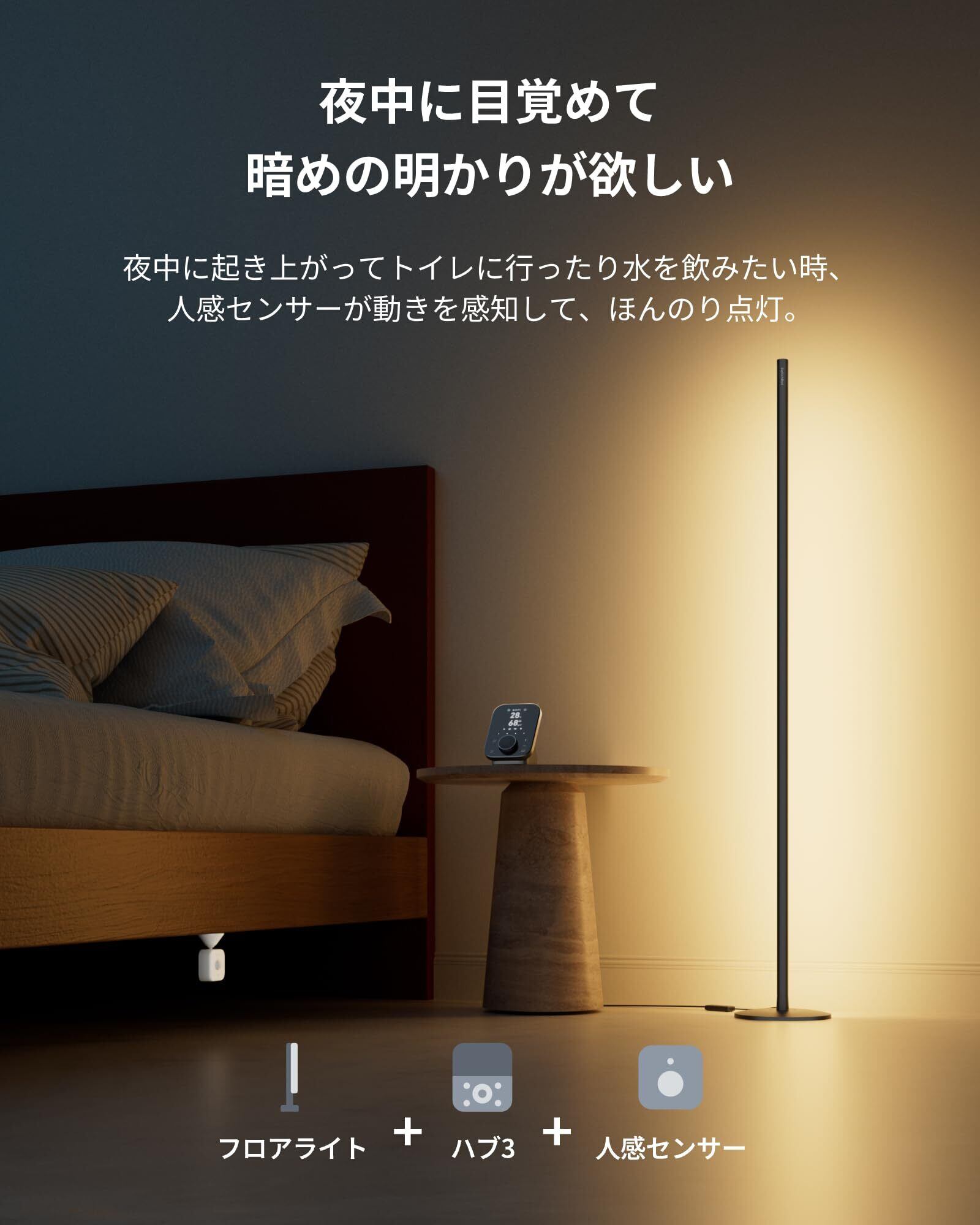 【SwitchBotデバイスと連動して、人の動きを合図にした自動シーンを実現】①人感センサーと連動(ハブ必要):夜中に起き上がってトイレに行ったり水を飲みたい時、人感センサーが動きを感知して、うっすら点灯。ベッドに戻ったら自動で消灯し、節電にも◎。 ②テープライトと連動:空間を包み込むようなダイナミックな演出で、パーティーや特別な日の雰囲気作りに。 ③リモートボタン&学習リモコンから操作:一戸建ての広い空間などで、従来の赤外線リモコンでは届かなかった場所からでも、フロアライトを操作できます。 ④ロックUltra&開閉センサーと連動(ハブ必要):ドアを開けるとライトが自動点灯。ロックが閉まると家電をまるごとOFF。 ⑤屋外カメラと連動:不審者を検知すると自動で点灯し、同時に警報を鳴らして不審者を威嚇。犯罪抑止力に。