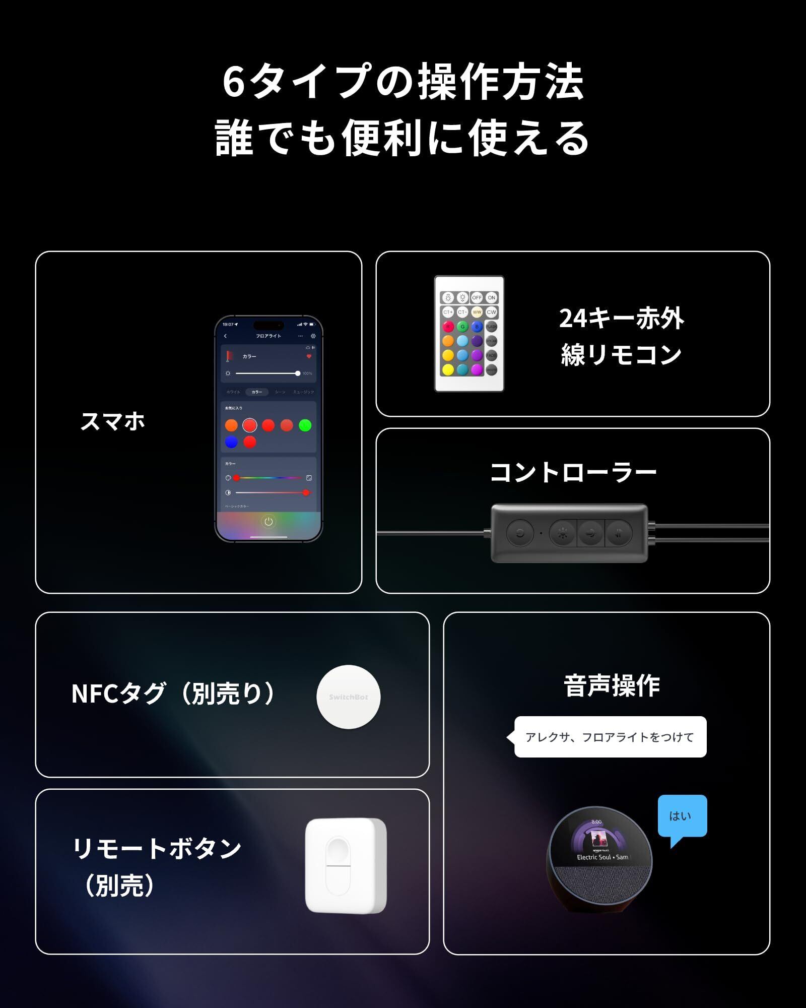 【コントロールは自由自在!家中のあかりを、あなたのスタイルで】SwitchBotフロアライトは、6つの多彩な操作方法に対応。 ①Alexa/Google Homeから、声だけで照明を調整できる「音声操作」。 ②再生中の音楽など、音に合わせて光がリズミカルに変化する「ミュージックモード」。 ③スマホを持たないお子さまや高齢者、アプリ操作が苦手な方でも簡単に使える「リモコン&有線コントローラー操作」。 ④明るさや色を細かく設定し、あなただけの光をカスタムしてシーンに登録できる「アプリ操作」。 ⑤例えば、夜10時にろうそくの灯りに近い優しい光で入眠環境を整えるなど、決まった時間に自動点灯/消灯が叶う「タイマー操作」。 ⑥Wi-Fi/Bluetooth対応でハブ不要。ネットワークが切れてもBluetoothで確実に操作できる「ローカルコントロール」。