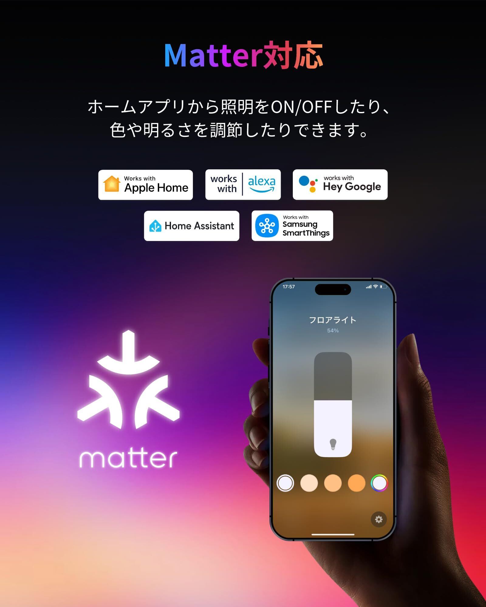 【Matter対応でホームアプリやSiriから直接操作できる】SwitchBot フロアライトは、Apple Home、Siri、Google Home、 アレクサなどのサードパーティーサービスから直接操作可能。例えば「Hey Siri、リビングのライトを暖色50%に」と声をかけるだけで、照明の色や明るさを変えられます。また、ネットワークが一時的に切断されても、ローカルからコントロール可能で、応答速度が速く、データの安全性も高いです。また、日常のシーンに合わせたオートメーション操作や、ほかのスマートホームデバイスとの連携操作が可能で、例えば家に着いたら灯りが自動で点いたり、映画を見る時は灯りが自動で暗くなったり、よりスマートな生活をサポートします。