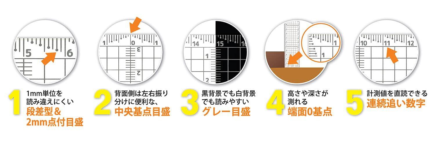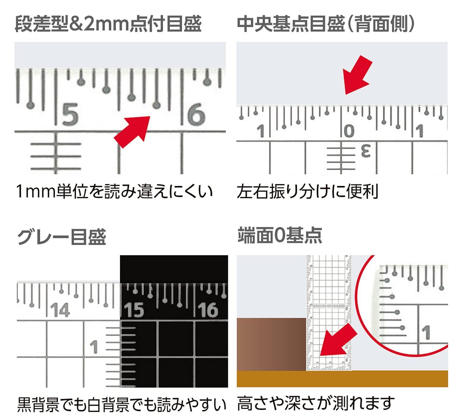 1mm単位を読み違えしにくい段差型&2mm点付目盛です。