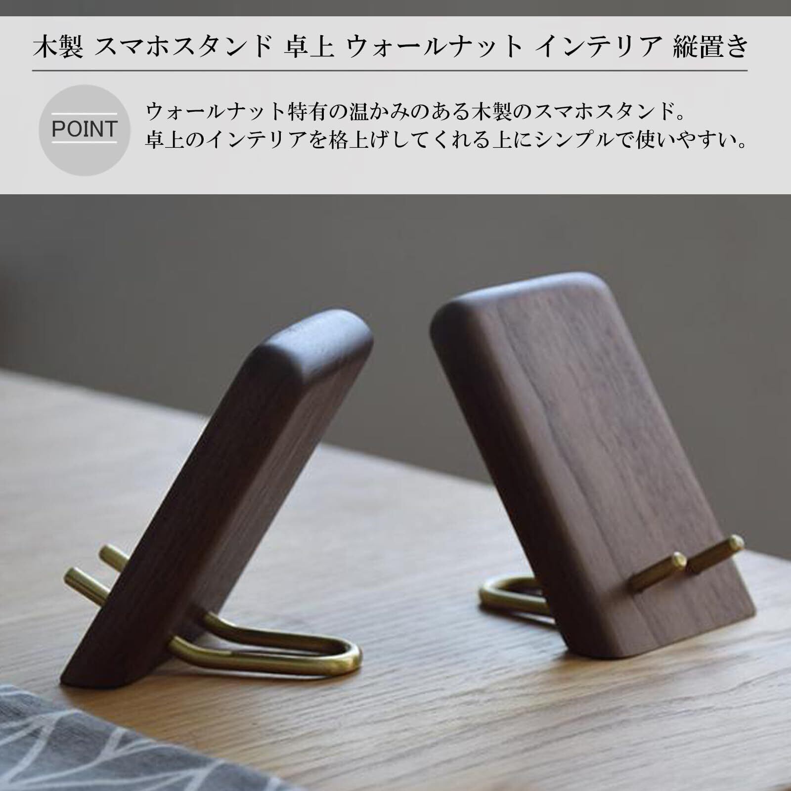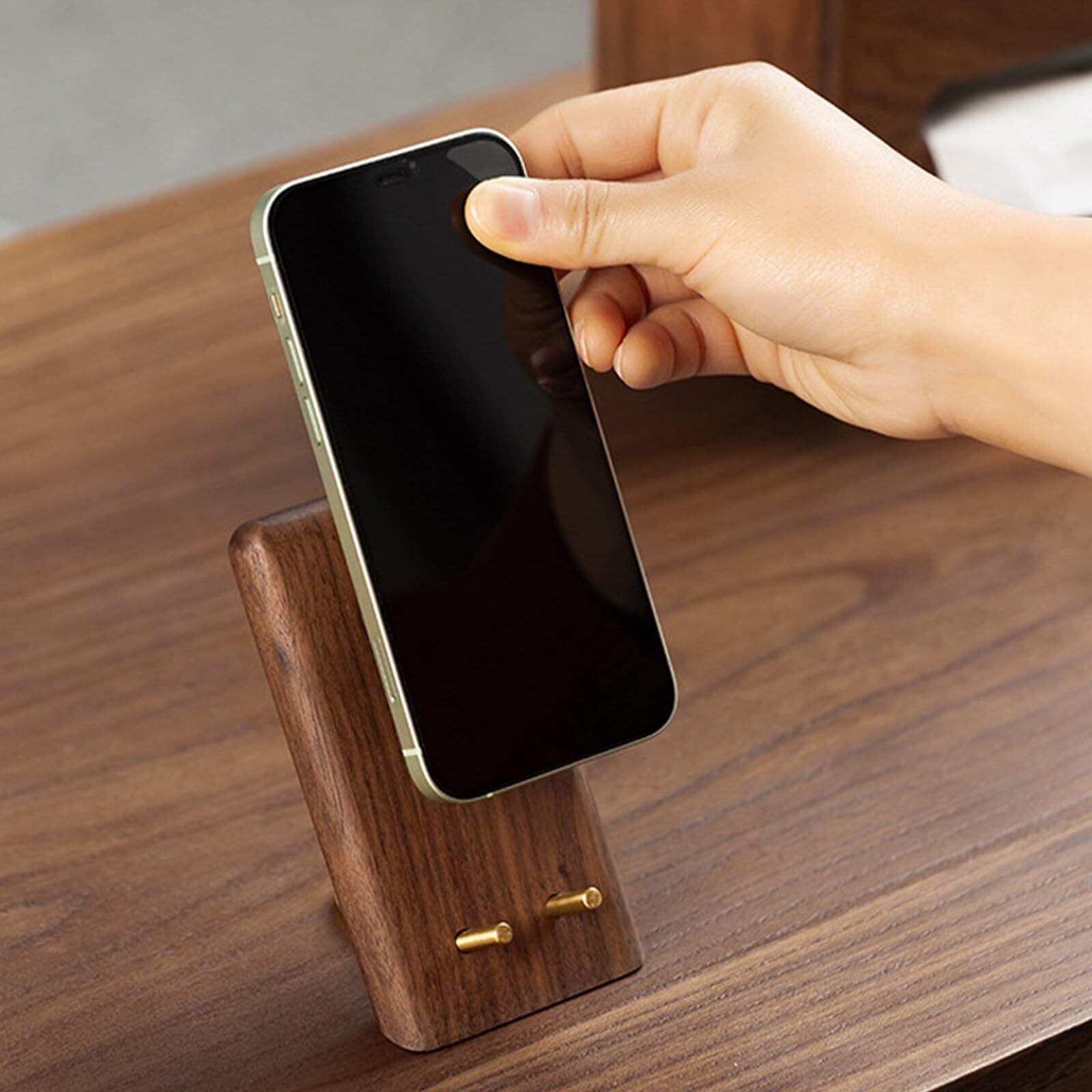 素材には世界三大銘木のひとつ、人気のウォールナットを採用しました。耐久性に優れ、使い込むほどに深い風合いが増していくのが特長です。本物の木製素材ならではのなめらかな肌触りは、プラスチック製品にはない満足感をもたらします。長く愛用できる高品質なスマホ置きをお探しの方に最適です。