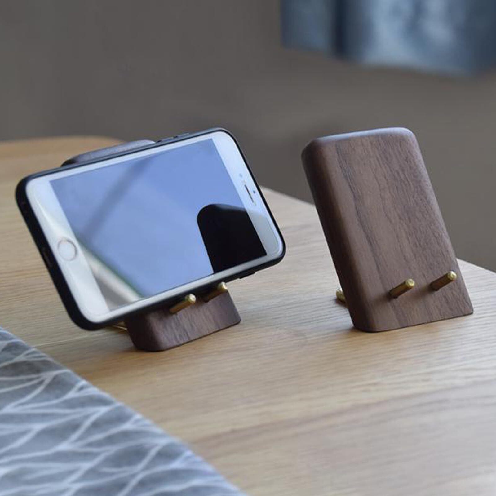 天然木ウォールナットの美しい木目と深い色合いを活かした卓上 スマホスタンド。置くだけでデスクやリビングがおしゃれなインテリアに変わります。洗練されたシンプルなデザインは、どんな空間にも自然に溶け込み、日常に上質なアクセントを加えます。スマートフォンやタブレットを支える機能性と、木の温もりが融合した逸品です。