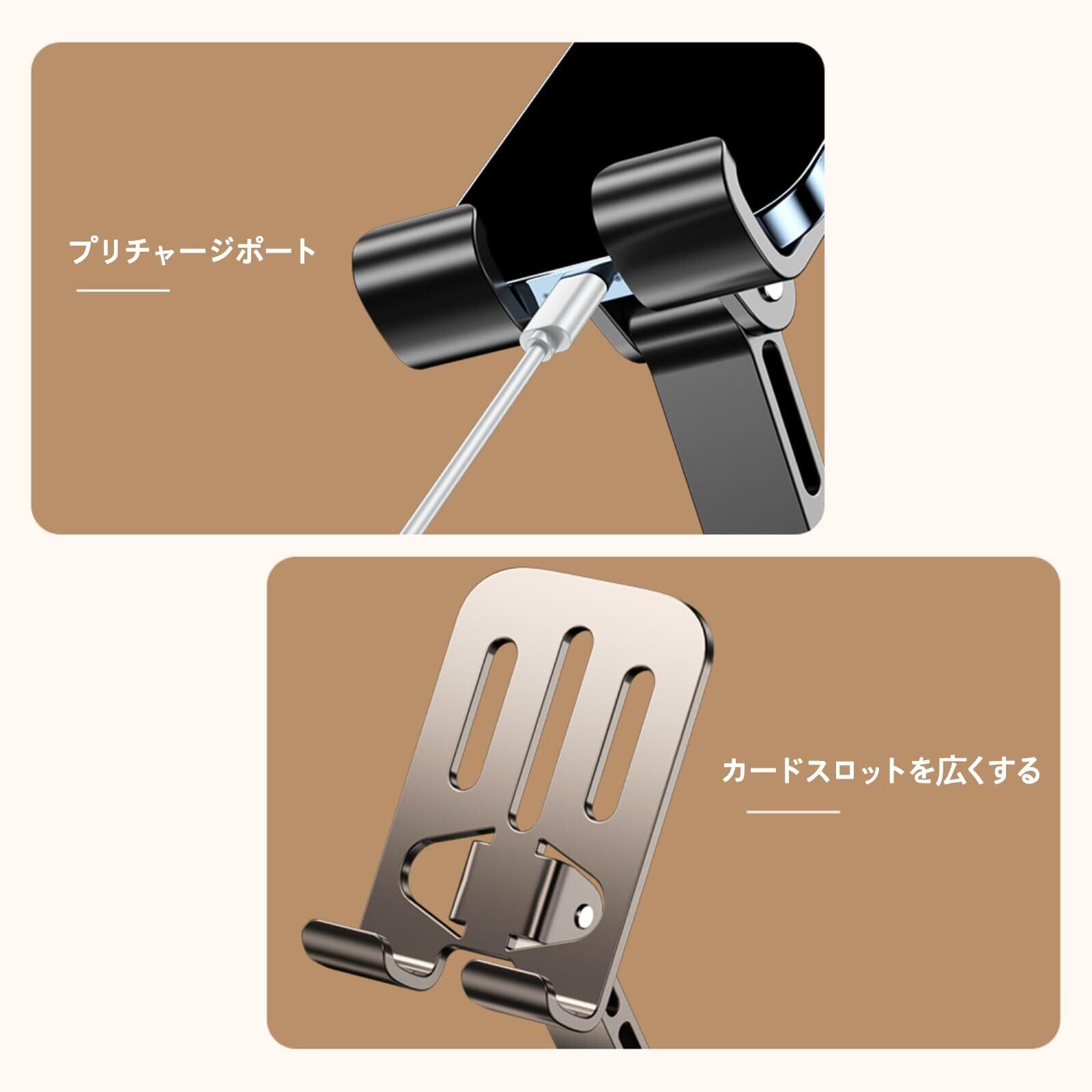 軽量アルミ合金製 アルミニウム合金を使用した軽量かつしっかりとした構造。机の上でがたつきにくく、スマホや小型タブレットの重量を分散して支えるため、長時間使用でも安定しています 。