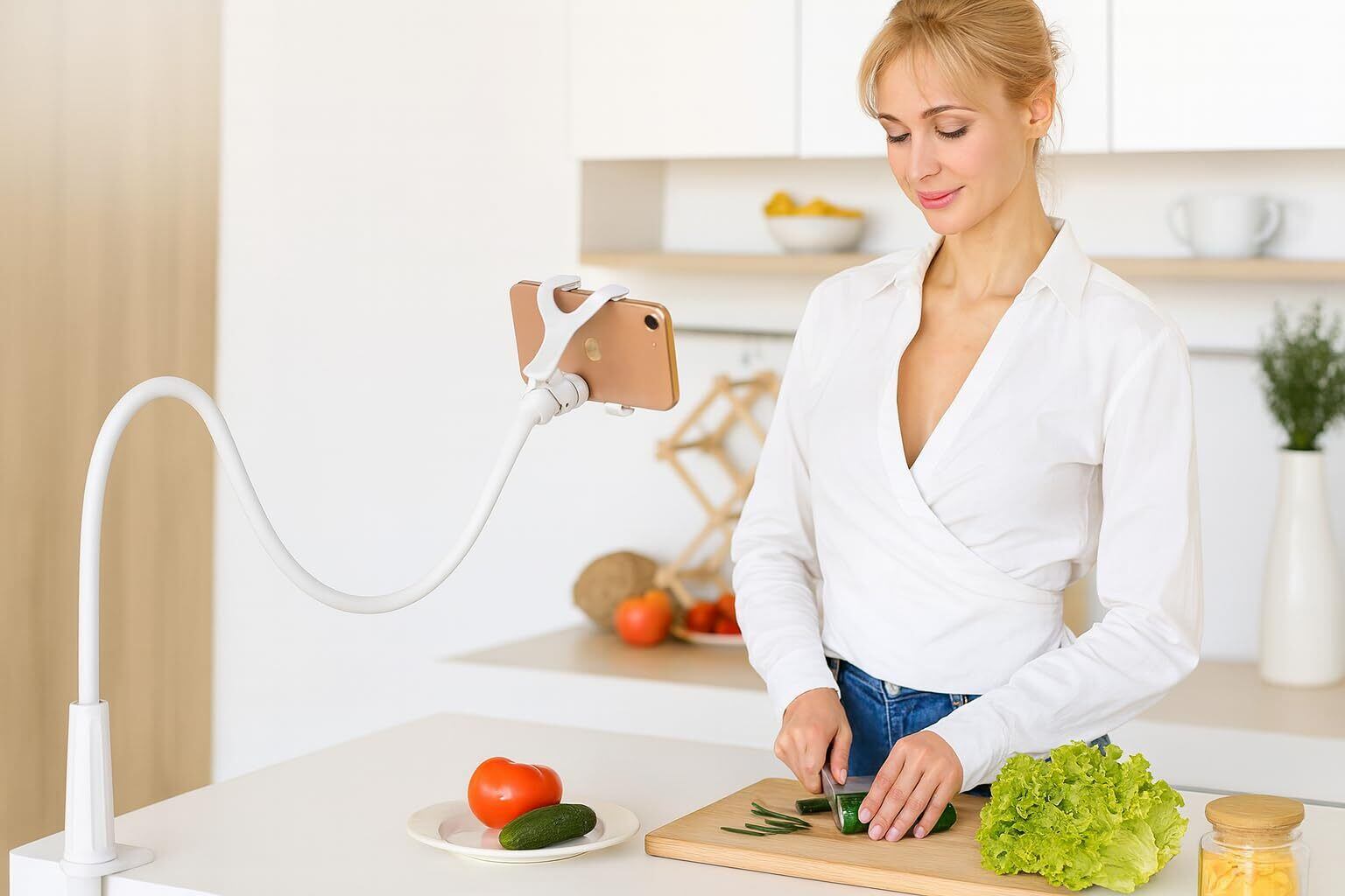 4.360°回転ホルダー&片手操作:ボールジョイントで360°回転。縦横切替もワンタッチ、配信・視聴・読書・レシピ表示まで幅広く活躍。