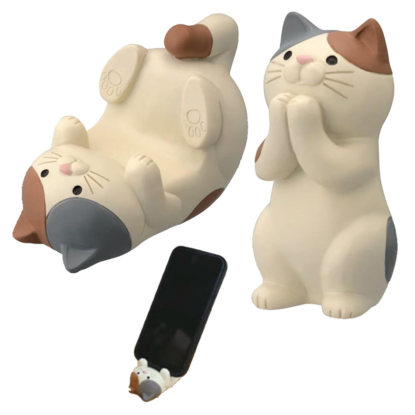 オフィスで癒される猫の置物!まんまるな猫背ポーズとお願いポーズがかわいい、卓上のスマホスタンドとメガネ立ての2点セットです。