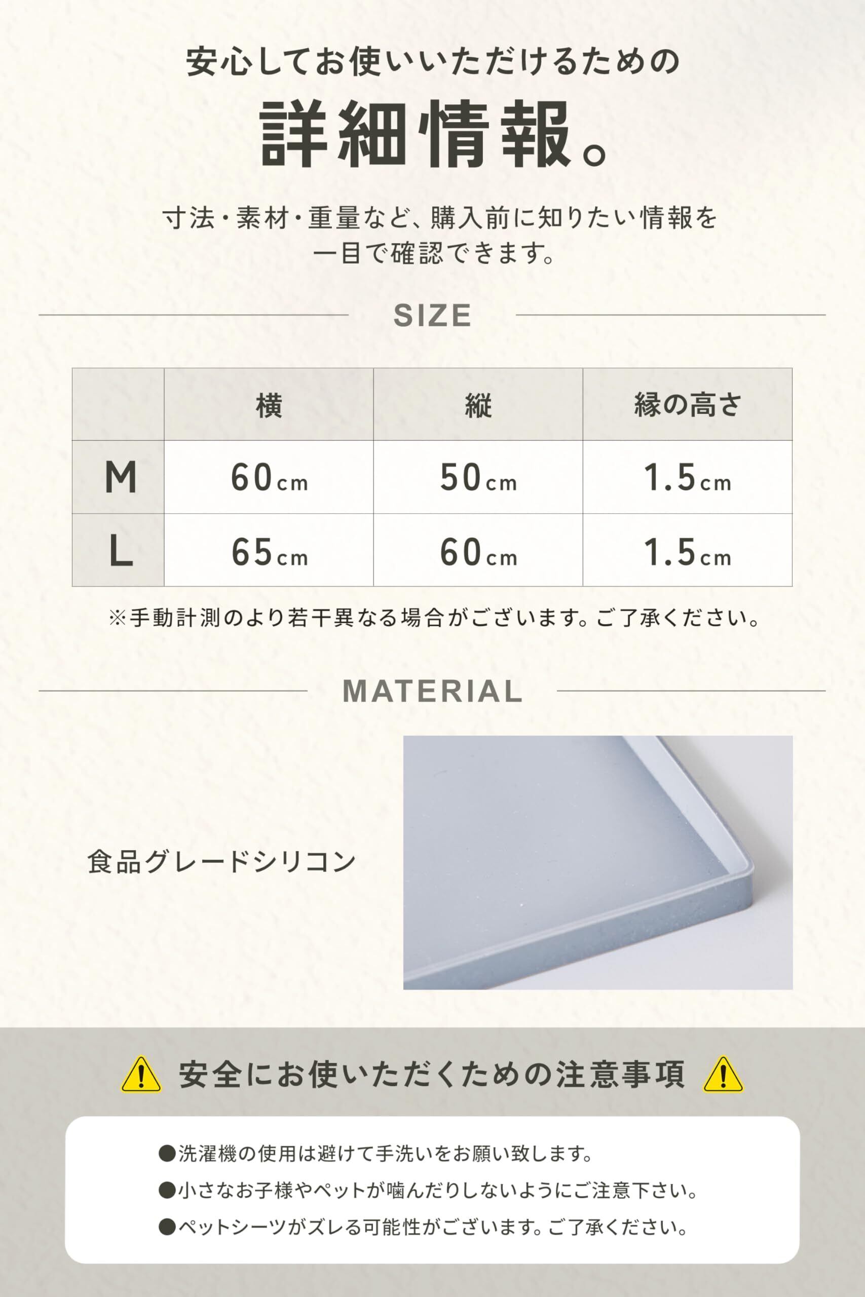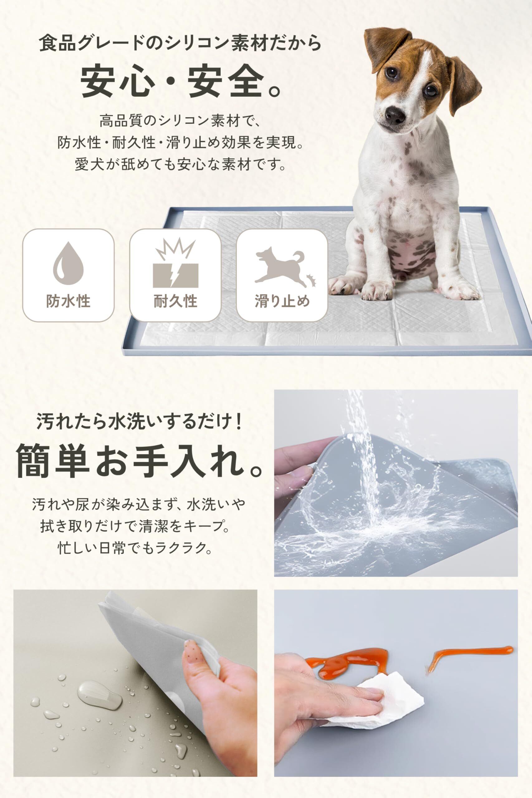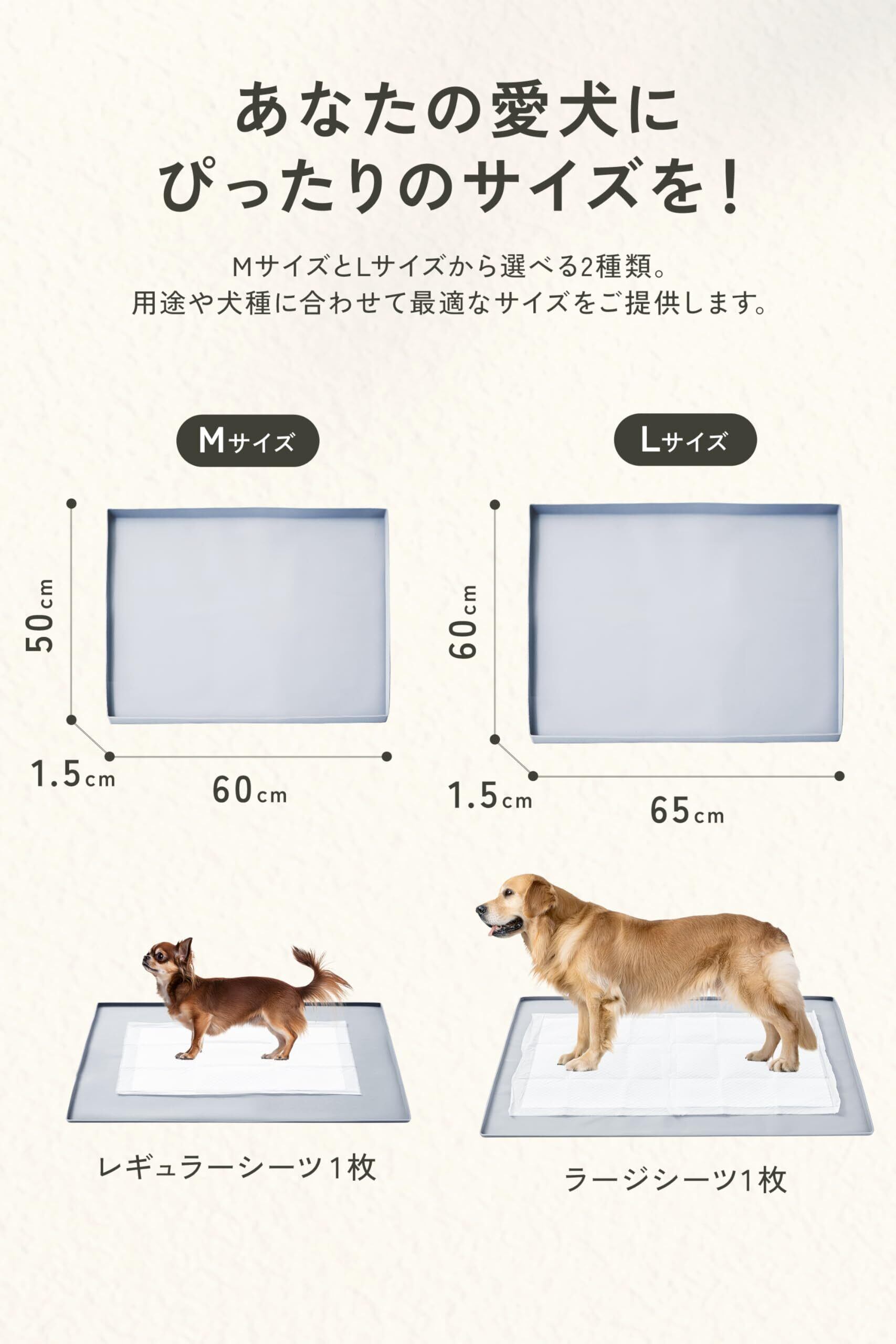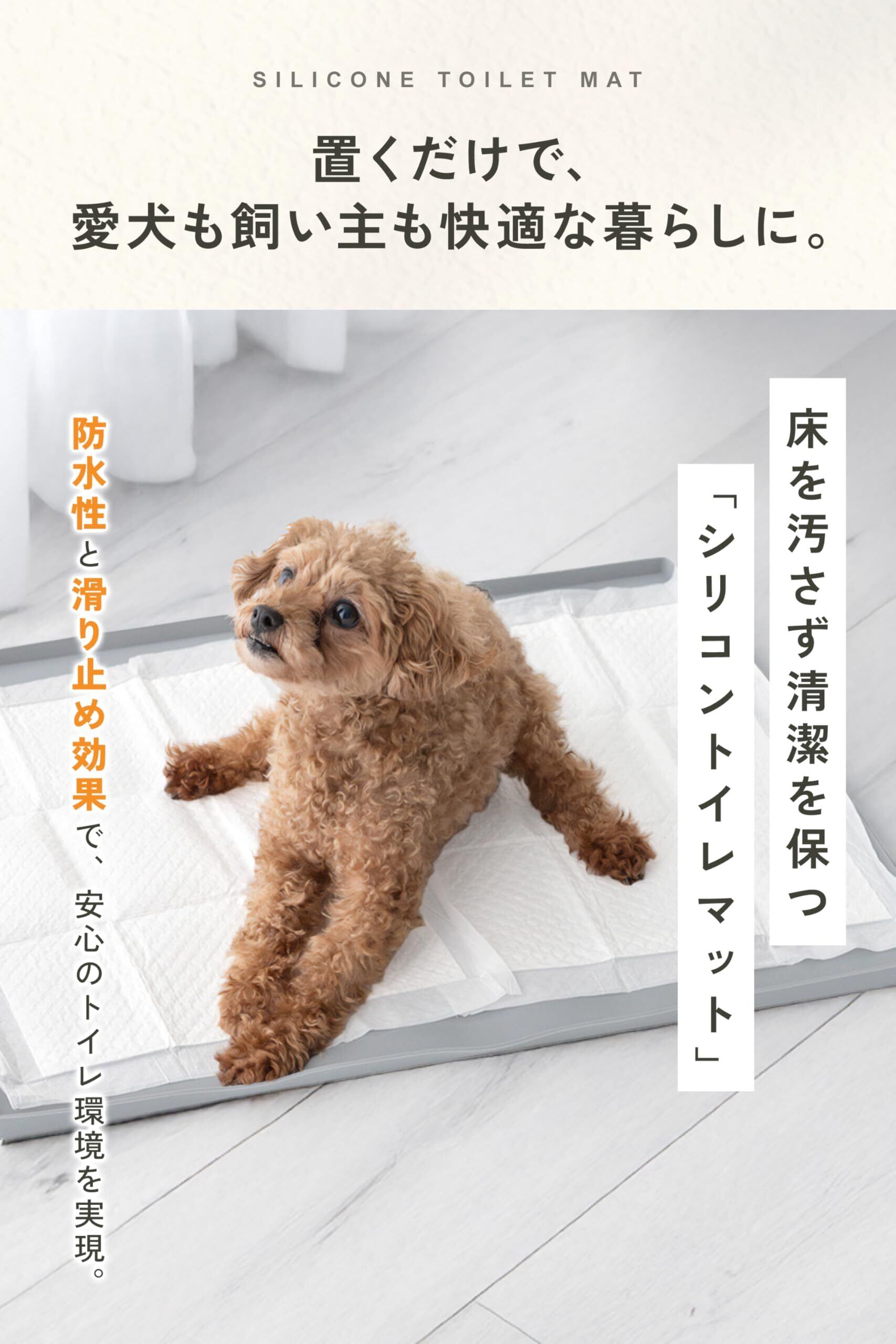 【商品の仕様とカラーバリエーション】 素材: 高品質シリコン / サイズ: Mサイズ50×60×1.5cm、Lサイズ60×65×1.5cm / カラーバリエーション: グレー・ブラック・ピンク・ベージュ・ライトグレー・エクリュ / 特長: 滑り止め加工・水洗い可能・抗菌仕様・液漏れ防止フチ付き / 用途: トイレトレーニング・高齢犬のケア・食事マット・多用途マット / 安全性: 有害物質不使用・ペット用製品基準クリア