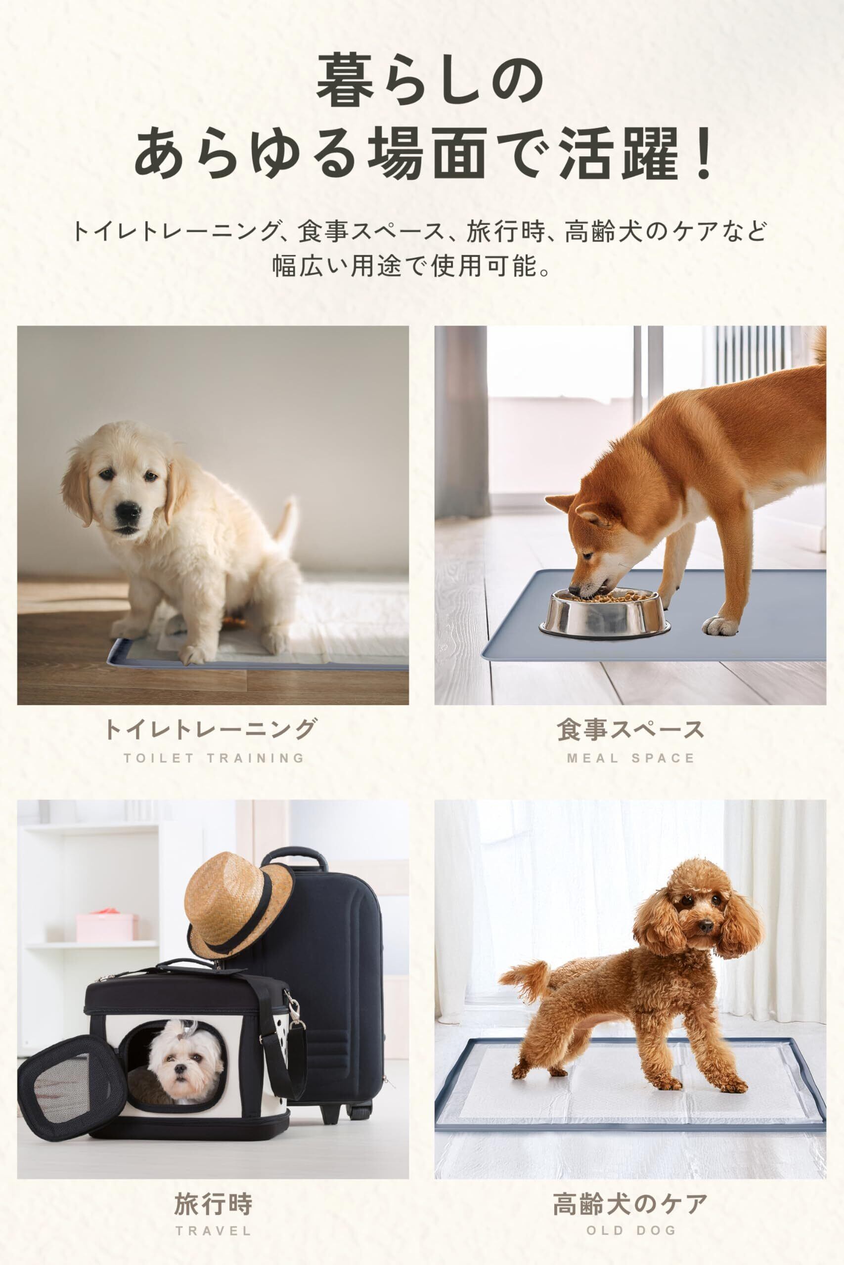 【多用途で便利なデザイン】 このマットは、トイレトレーニングや高齢犬のケアはもちろん、食事時の滑り止めや床の保護としても活用できます。滑らない表面がペットの足腰への負担を軽減し、旅行やアウトドアでも便利に使える軽量設計です。丸めてコンパクトに収納できるため、多頭飼いのご家庭や様々な生活スタイルにも柔軟に対応します。この1枚で、愛犬の生活をより快適で安全なものにします。