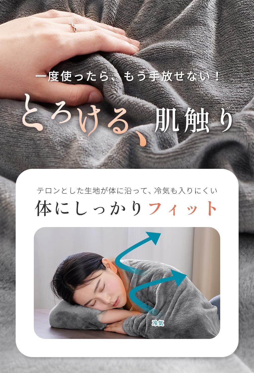 【ふわふわ、なめらか】 高密度フランネル生地を採用。指先でなでると「すべすべ〜」と気持ちよく、ひざにかけた瞬間ふわっとあたたかさが広がります。肌あたりがやさしいので、長時間の使用でもチクチクせず快適。