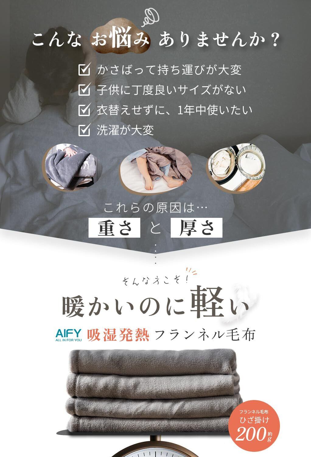 AIFY 毛布 ひざ掛け ブランケット 秋冬用 あったか ふわふわ フランネル マイクロファイバー 掛け毛布 軽量 薄手 洗える コンパクト 冷房対策 四季適用 おしゃれ 70×100cm グレー