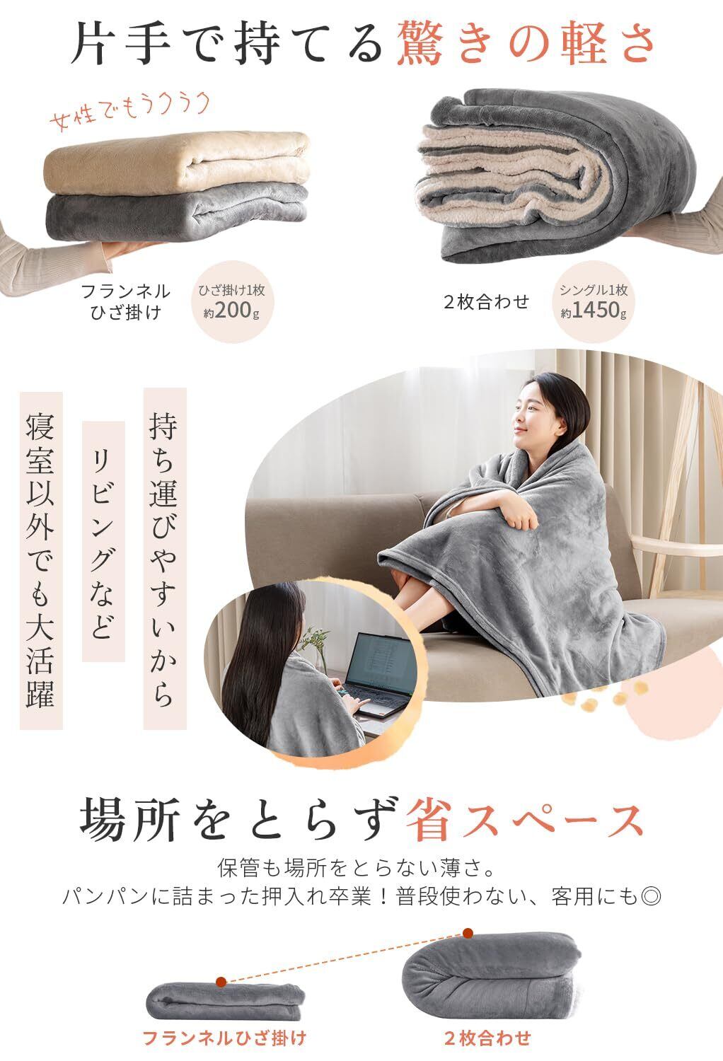 【いろんなシーンで活躍】 約70×100cmのコンパクトサイズで持ち運びも簡単。オフィスでの冷房対策、ドライブ中、ソファでのくつろぎタイムにちょうどいいサイズ。お子様のお昼寝用にもぴったり。