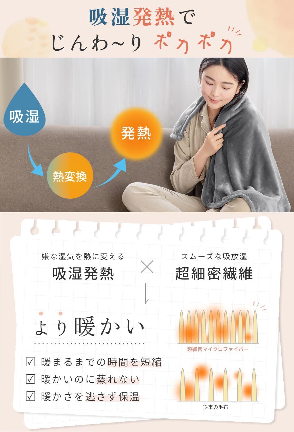 【軽いのにしっかり保温】 見た目は薄手なのに、繊維の間にしっかり空気を抱え込みポカポカ。冷房の効いたオフィスや冬の朝晩でも体をやさしく包み込みます。重さを感じないから肩にかけてもラクラク。