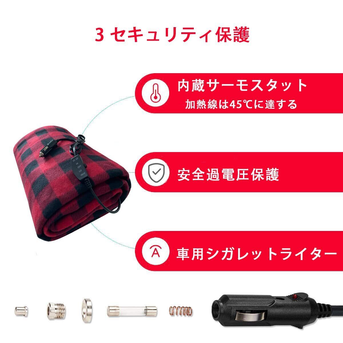 車載毛布 ホットブランケット 車中泊 電気毛布 12V電気毛布 電気ひざ掛け 車載用ヒートブラン ホットヒーター毛布 HI/OFF/LO 3段階切り替え 防寒保温 過流過圧保護 電気ブランケット 多機能カー毛布 前席 後席 145*100cm (黒赤)