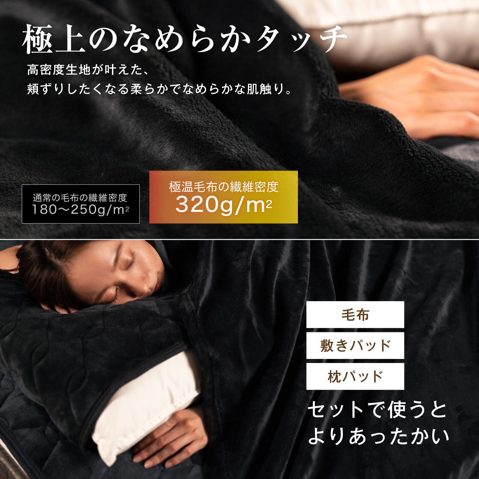 【高級感あふれる肌触り】極温毛布は触れた瞬間にわかる上質な肌触りが特徴です。軽量でありながらも、暖かさには一切妥協しない、贅沢な温もりが感じられます。毛布をかけた瞬間、その高級感に思わず手放させなくなってしまうこと間違いなしです。 【セット購入でさらに暖かい】 極温シリーズの敷パッドや枕パッドと組み合わせるとさらに暖かく、快適な冬の節電生活もサポートします。 この冬、極温毛布で寒さを乗り切りましょう!