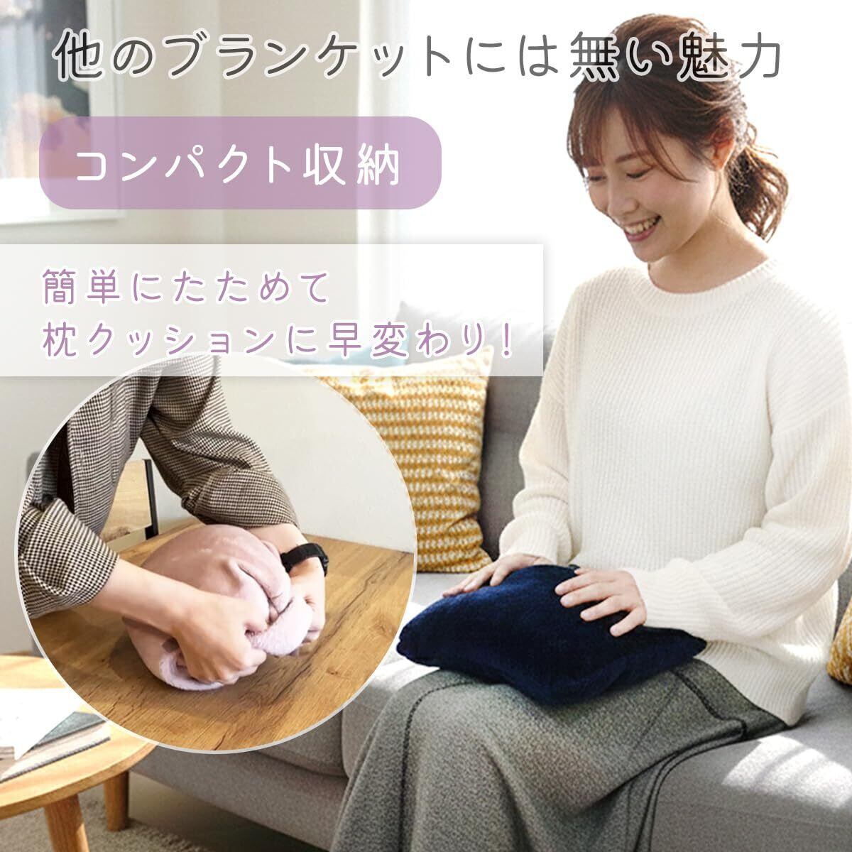 【くるんと収納、2way】くるんけっとは10秒程度で折りたたんで簡単に収納できます。くるんと収納したら、クッションや枕として2way利用できるので省スペース。収納用袋は本体と一体化しているポケットイン型で、袋を紛失する心配がありません。