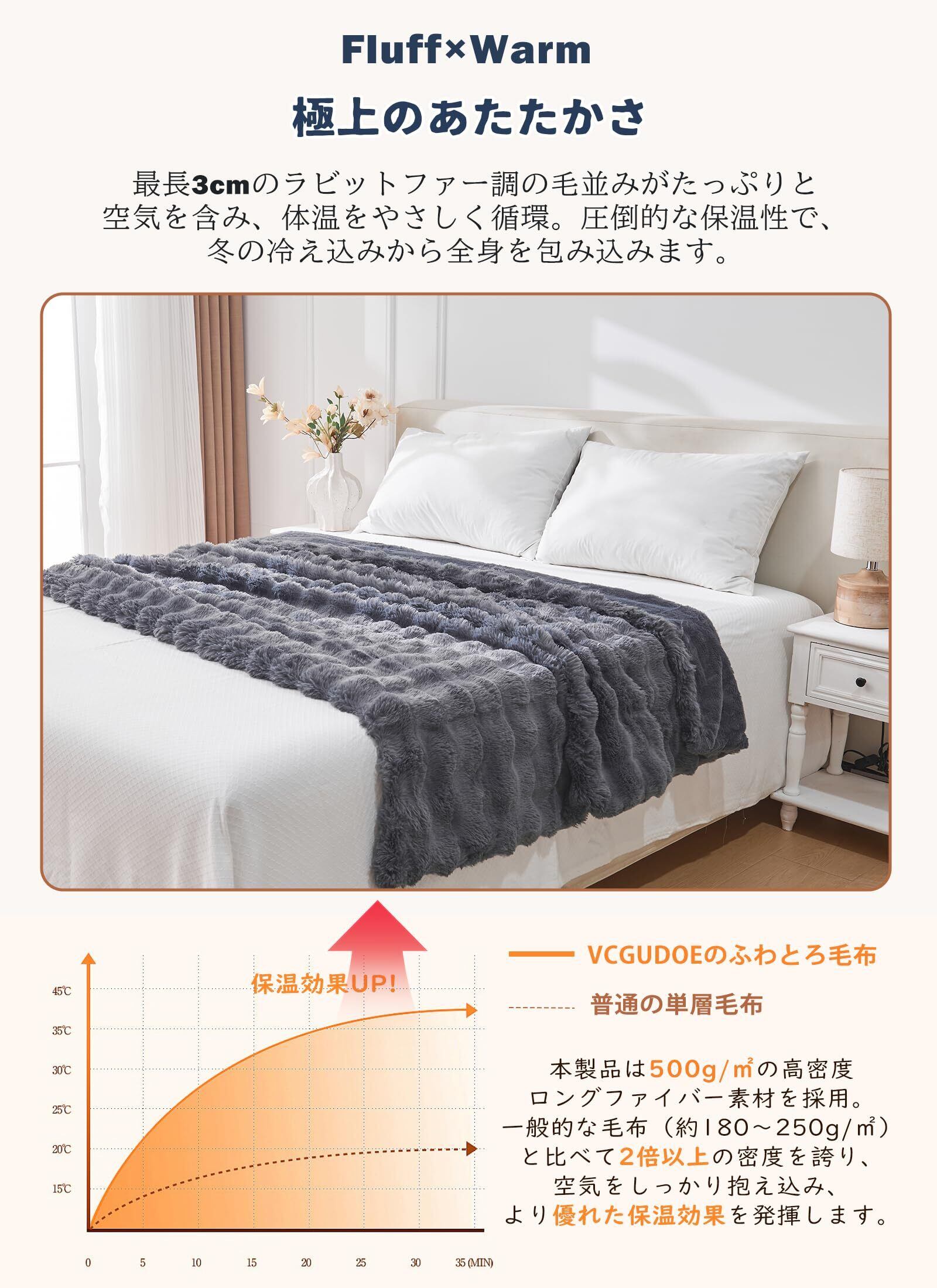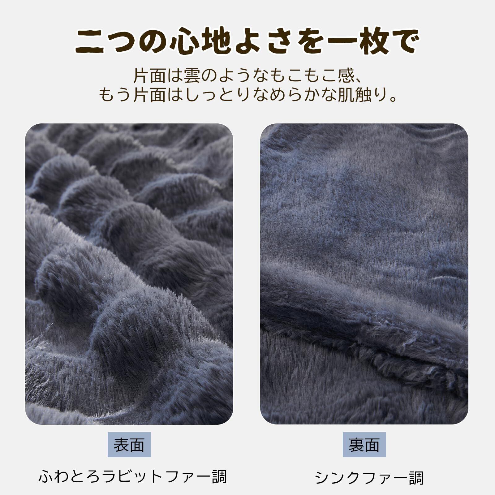 【とろけるような極上の肌触り】 表面には500gsmのラビットファー調フェイクファー、裏面には230gsmのプラッシュ素材を採用。ふわふわ、とろとろの感触はまるで雲に包まれているかのような心地よさ。お子様から大人まで安心して使える低ホルム仕様で、やさしく肌を包み込みます。
