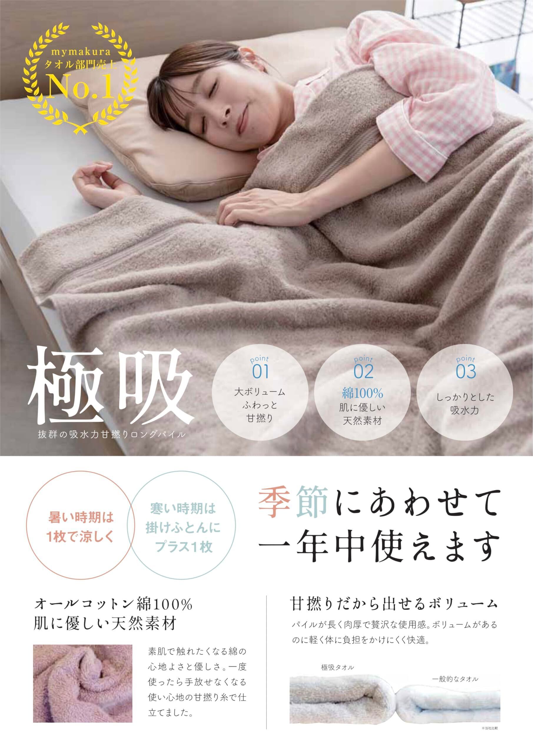 大人気、極吸タオルをタオルケットにしているので、タオルそのままの吸水性を持ちます。