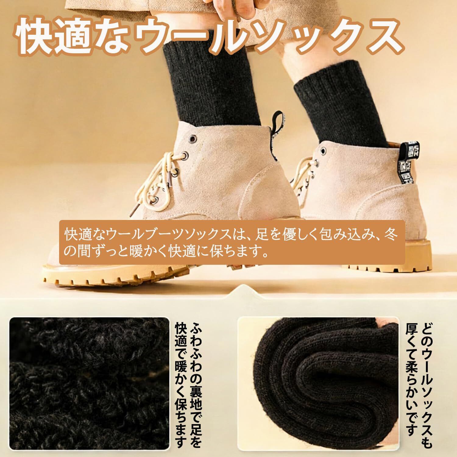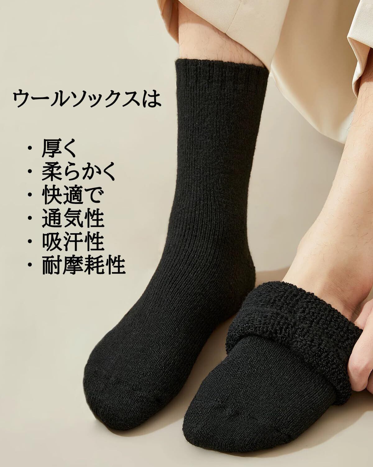 【天然ウール使用・優れた保温性】 厳選された真ウールを採用し、寒い冬でも足元をしっかりと暖めます。自然素材ならではの柔らかな肌触りと高い断熱性で、快適な履き心地を実現。(ご注意:天然ウールで作られた靴下は、着用後に毛玉ができる場合があります。)