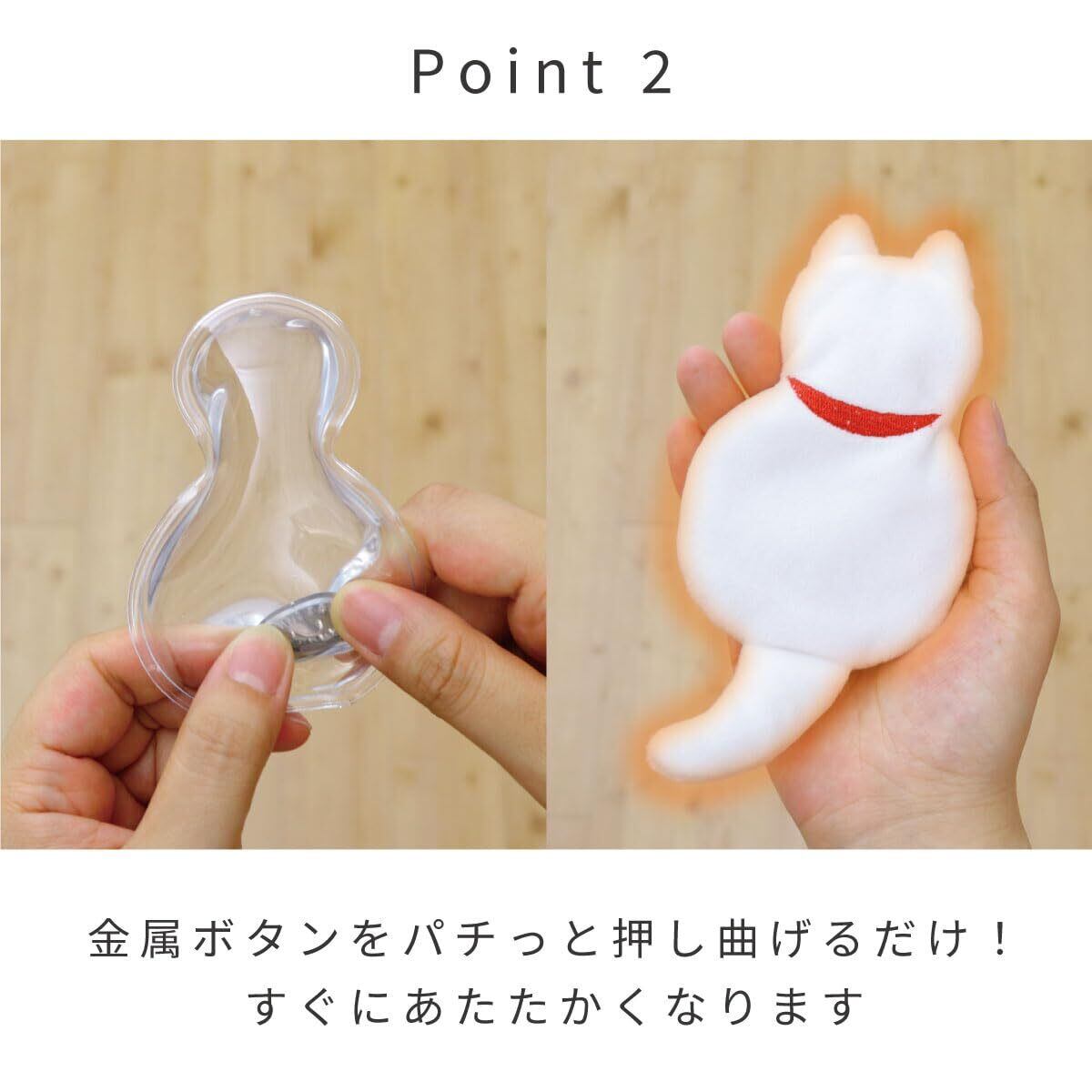 【使用方法】1.中のカイロ本体の金属ボタンをカチっと押す。