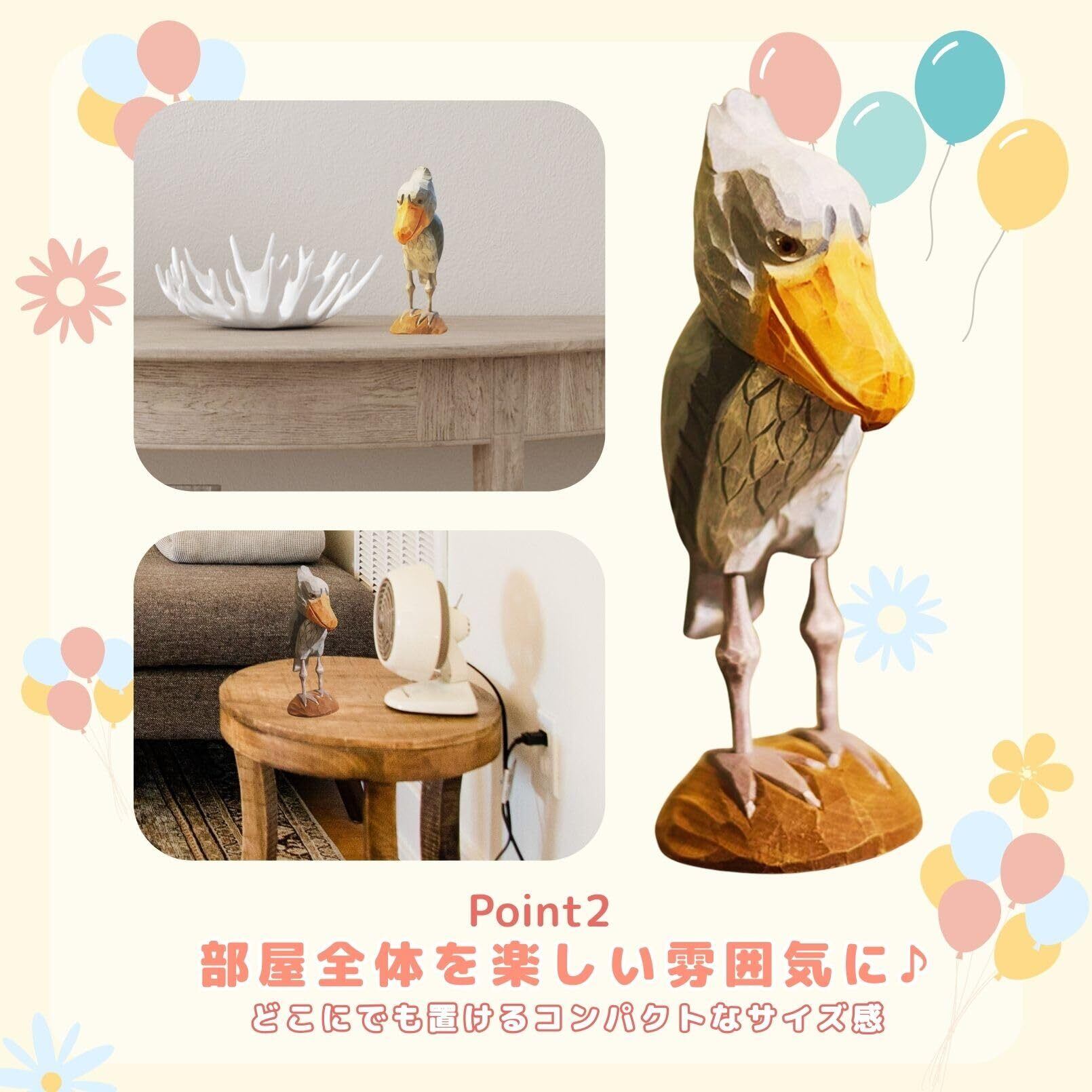 【部屋の雰囲気を軽やかにチェンジ】 かわいくも不思議な魅力を持つハシビロコウ オブジェが、部屋のアクセントに最適。デスクや棚の上に飾るだけで、空間が一気に明るく親しみやすい雰囲気に。気軽に楽しめるインテリアとして、北欧好きにもぴったりです。