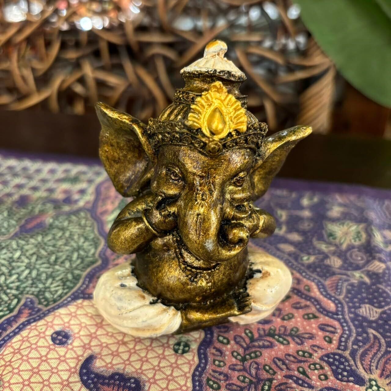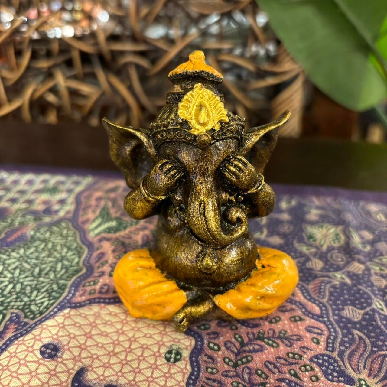 「見ざる・言わざる・聞かざる」のガネーシャバージョン。 見ないガネーシャ・聞かないガネーシャ・言わないガネーシャ カラフル 3体セットです。 ヒンドゥー教の神様ガネーシャのかわいい仕草がたまらない。「夢を叶えるゾウ」として世界中で愛されている ヒンドゥー教の神様ガネーシャが、3つのポーズで愛嬌たっぷりに「見ざる・言わざる・聞かざる」をまねて見ないガネーシャ・聞かないガネーシャ・言わないガネーシャのポーズで登場。 ほほえましいそのお姿は、様々なお部屋のアイキャッチアイテムにぴったり。 シックな色合いのグリーン、イエロー、ホワイトのズボンをはいたガネーシャ像。3体セットでお届けします。 アンティーク調の仕上がりにシックな色合いのカラーパンツがおしゃれなガネーシャ様。 全体に丸みを帯びた愛らしいフォルムで、どの角度から見てもほっこりしてしまいます。 玄関に、トイレに、そしてオフィスの自分の机の横に。教えを与えてくれるガネーシャ様がいつも近くで見守ってくれます。 手の平サイズで、ちょこんと座る小さくて可愛らしいお姿に思わず笑みがこぼれます。