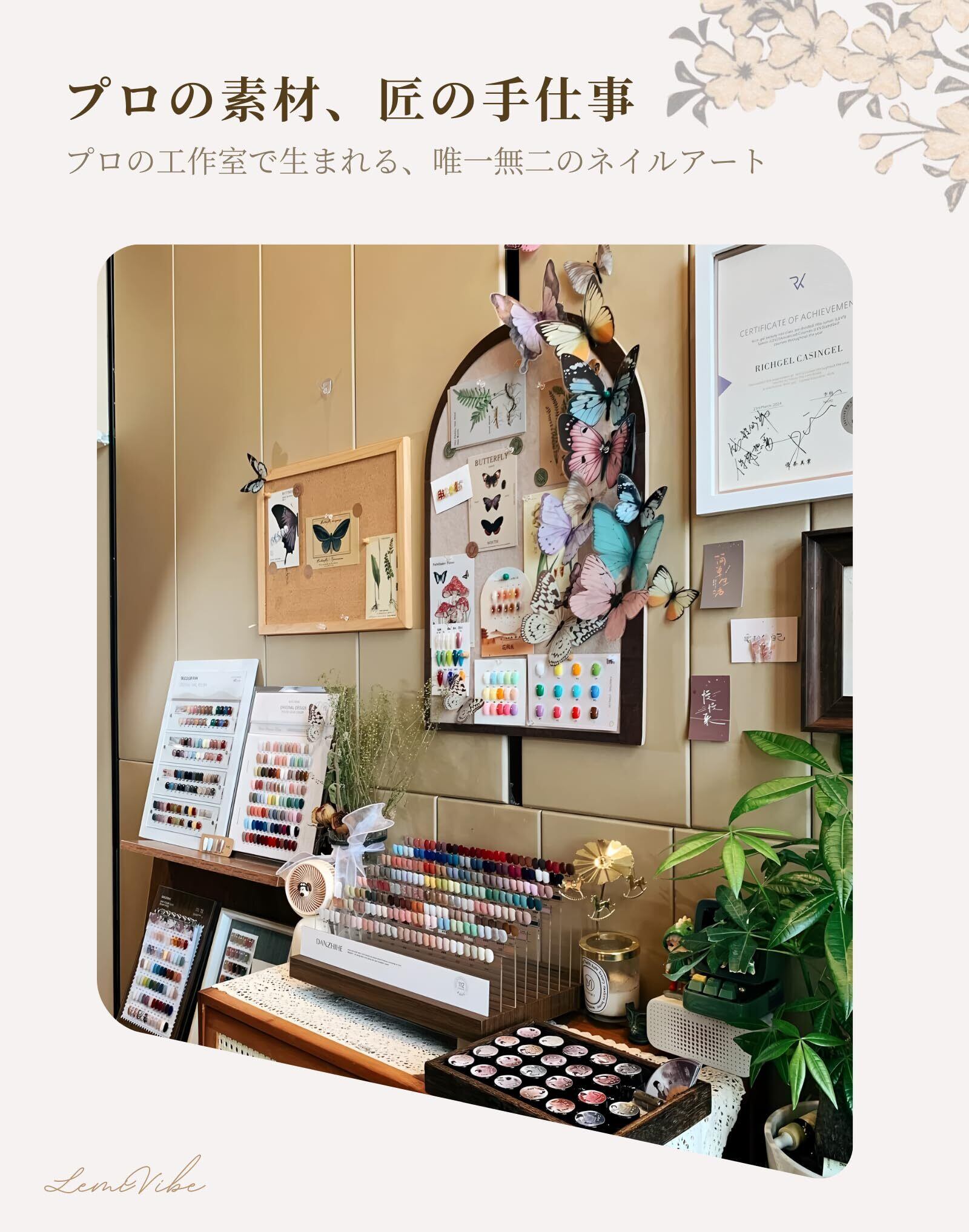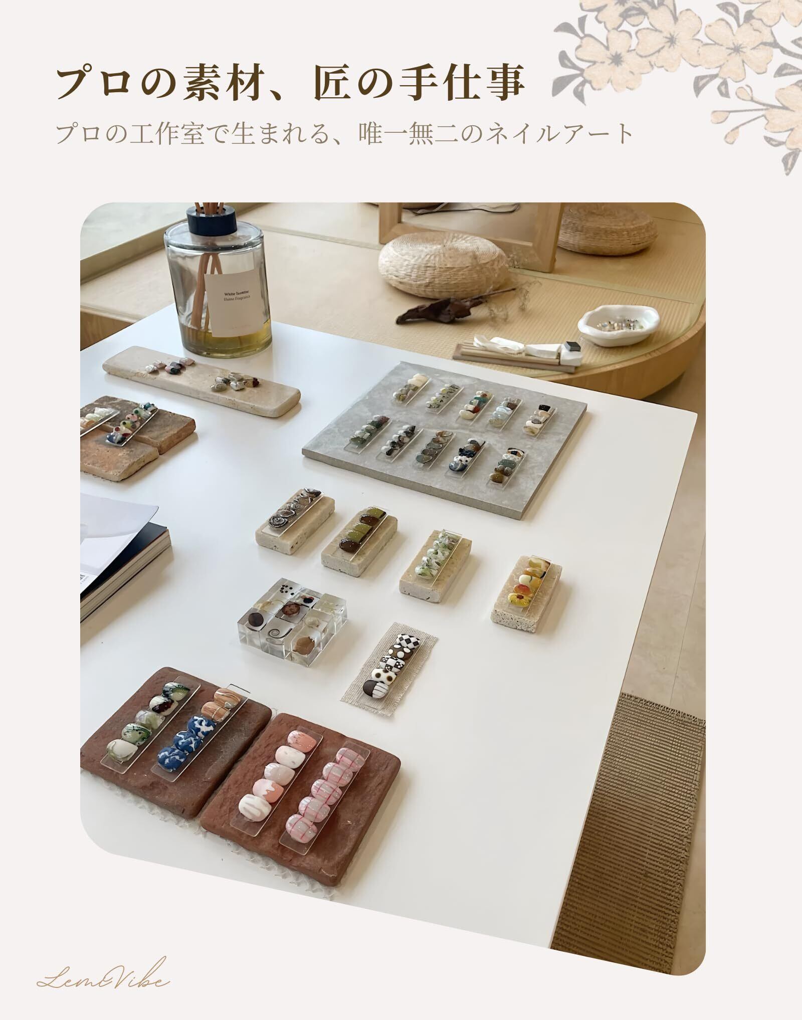 リアルなネイルアート 機械製の使い捨てネイルとは異なり、LemiVibeのネイルは極薄のシミュレーションネイルを使用。7工程のネイルアートで、サロン級の仕上がりを実現。繰り返し使える高品質ネイルです。