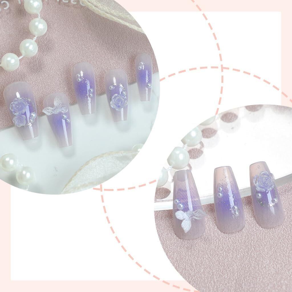 ネイルチップ 夏向けデザインを中心に展開し、優しいネイルチップ 紫の色調に加え、輝く蝶々の装飾を融合させたネイルチップ 蝶々モデルが人気を集めています。方形の全覆盖甲面設計で甲型を美しく修飾し、手元を一層精巧に見せます。日常の通勤や買い物、恋人とのデート、クリスマスやバレンタインデーなどの祝日パーティーで着用すると、造型のハイライトを引き上げ、周りの視線を自然に集めることができます。ネイルデザインの流行をキャッチアップしたファッションアイテムとして、あなたのスタイルを引き立てます。