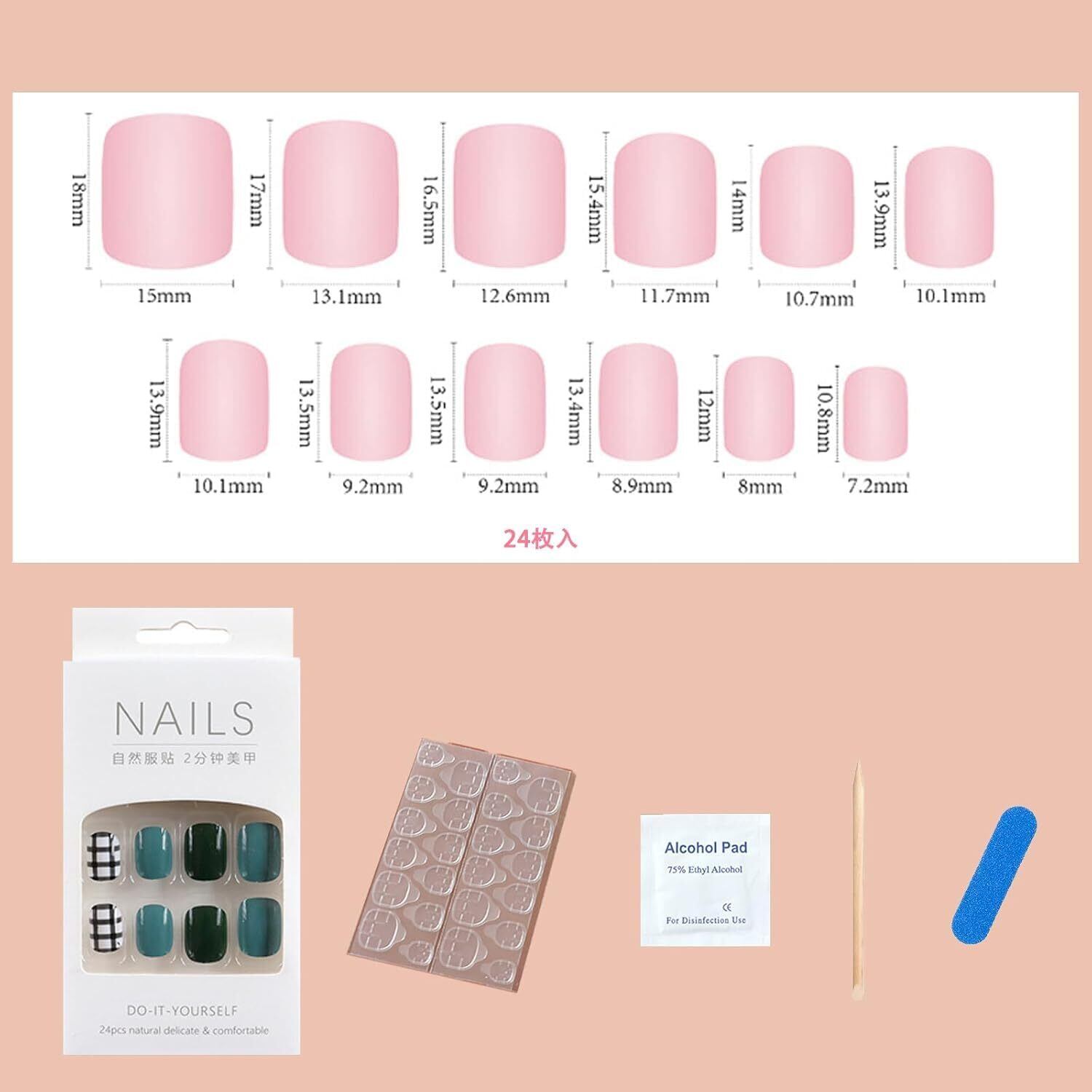 【リッチセット内容】この商品には24枚のセットが含まれており、予備用のネイルチップも一緒に提供されます。さらに、両面テープや爪やすり、木の棒もセットに含まれています。到着後すぐに使用できるので、お客様に便利です。さらに、両面テープに2秒間熱風をあてると、さらにしっかりと貼り付けることができます。