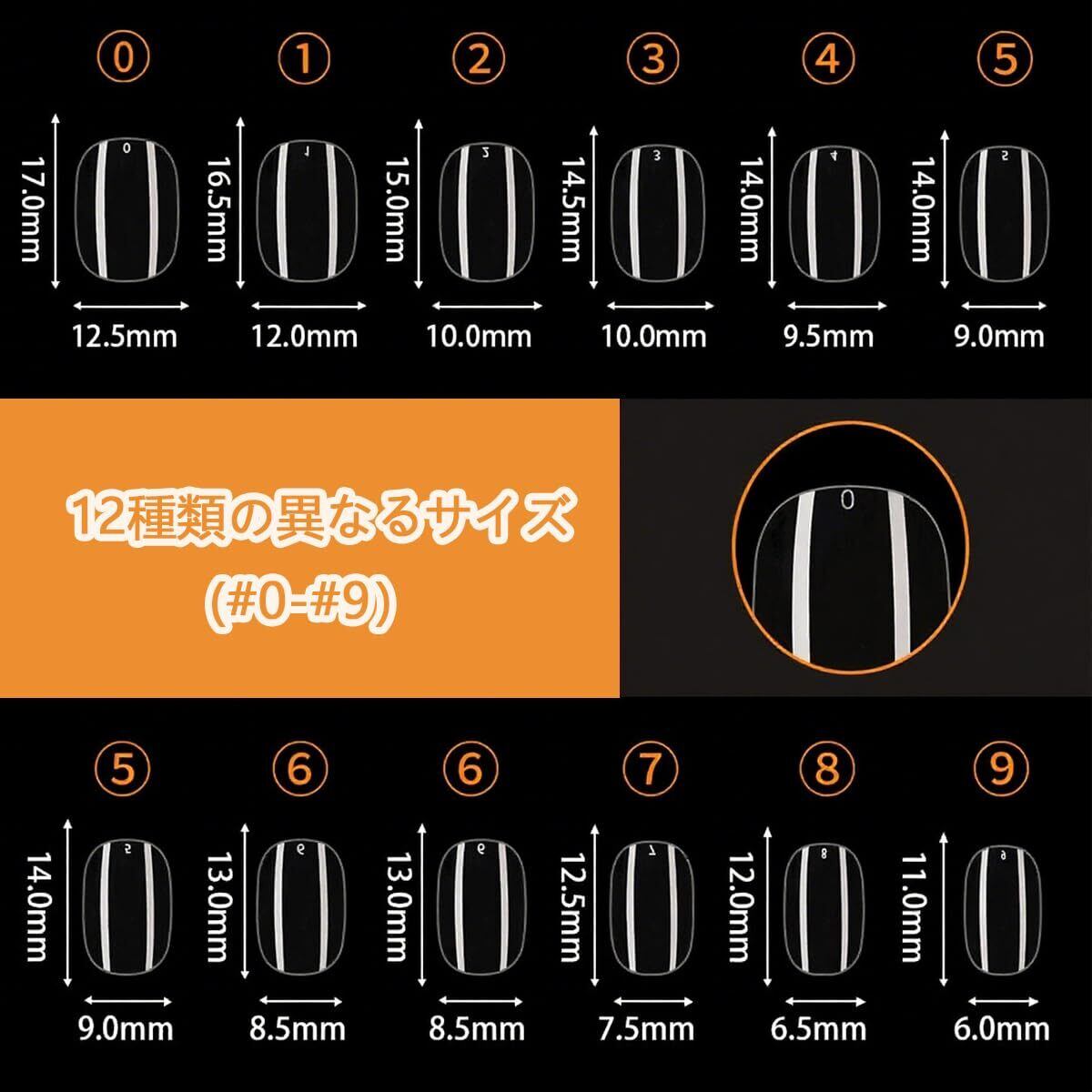【商品仕様】透明な爪ステッカーセットには12種類の異なるサイズが含まれており、各サイズに10枚の爪部品が付いていますので、ご自身にぴったりのサイズを簡単に見つけることができます。