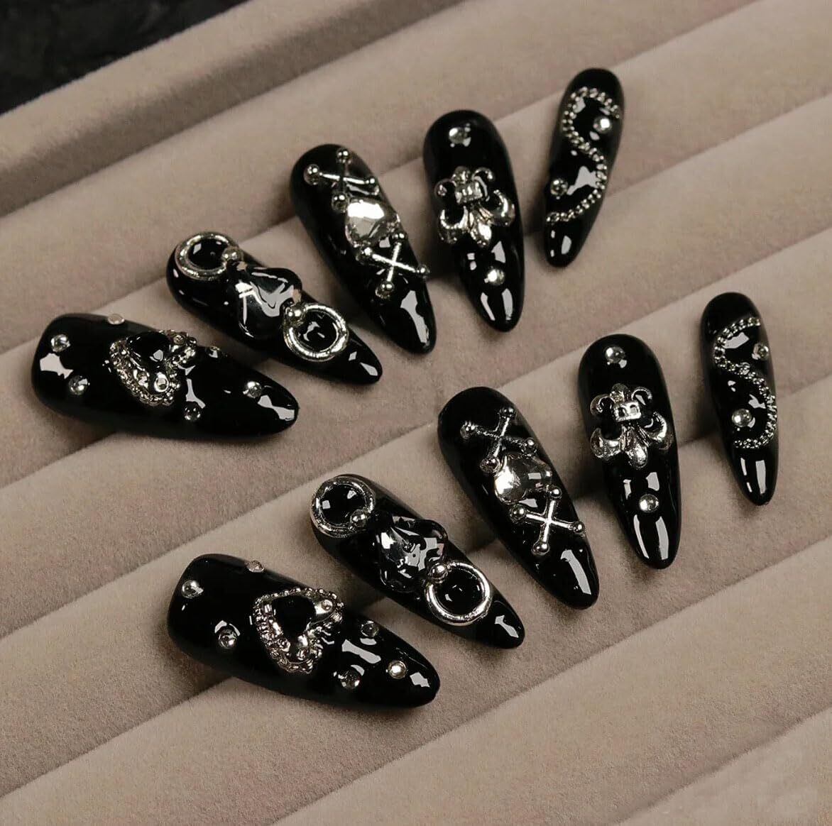 ネイルチップ 黒 手作りネイルチップネイルチップ ネイルシールかわいいピンクつけ爪入学式 卒業式 韓国 成人式 結婚式ネイルチップ3Dラインストーンキャッツアイ 10枚入おしゃれ (黒, S)