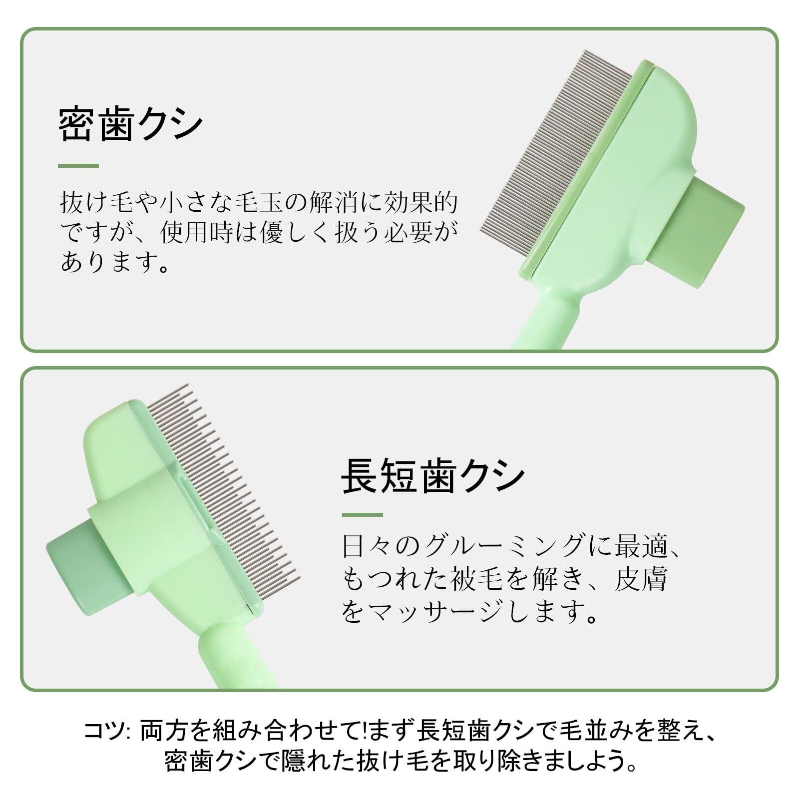 【2種類の専用コームで毛質・用途に応じたケア】長短歯コーム(アンダーコート処理)と密歯コーム(毛玉解消・表面仕上げ)の2点セット。長毛種の換毛期ケアから短毛種の日常ブラッシングまで、犬猫両方の毛質に対応。