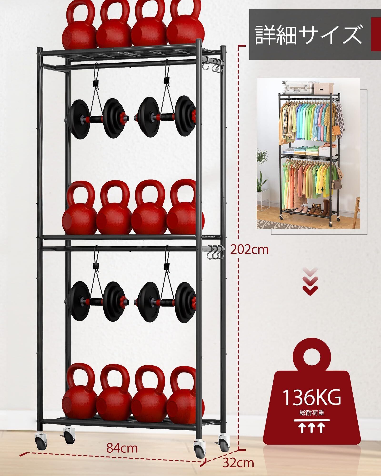 ハンガーラック 頑丈 大容量 2段収納 洋服ラック|棚・フック・キャスター付き|幅84×奥行32×高さ202cm|寝室・バルコニー・ランドリー用|ブラック