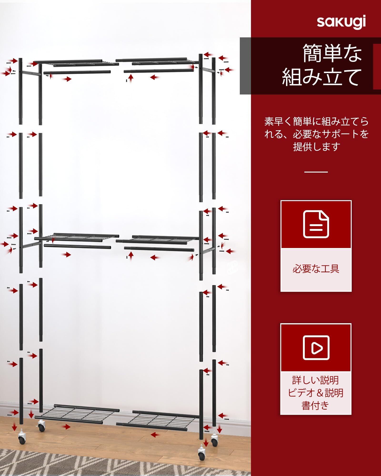 簡単取り付け:この頑丈な衣装ラックは、必要なツールがすべて揃っており、簡単に設置できます。詳細な取扱説明書とステップバイステップのビデオガイドにより、一人でスムーズに組み立てが可能で、サポートなしでも簡単にセットアップできます。