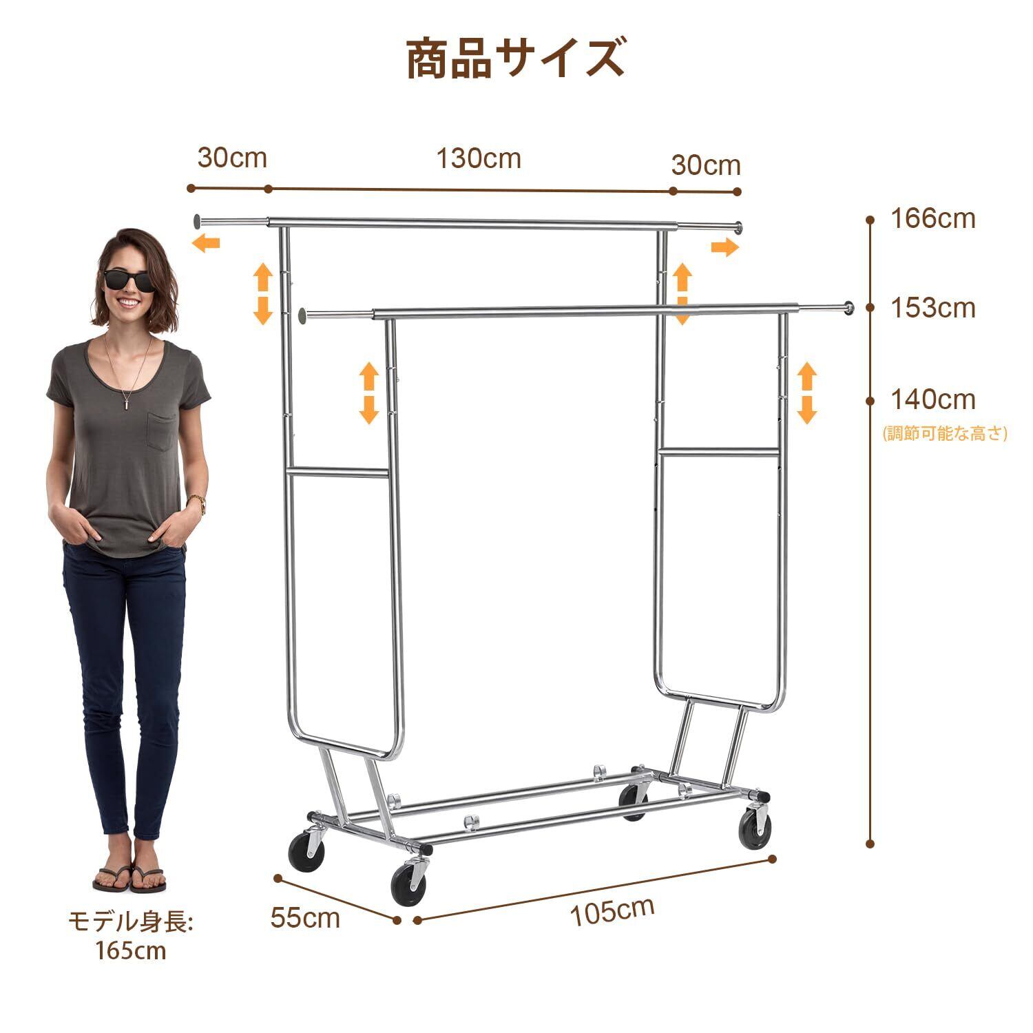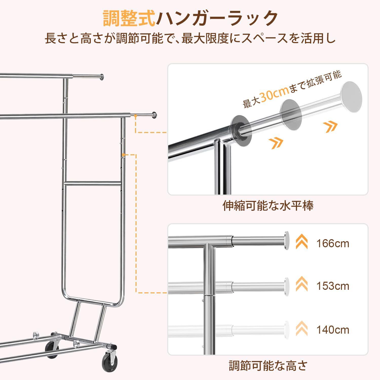 【高さ・横幅調節可能】このハンガーラックは、高さを140〜166cm、幅を130〜190cmまで簡単に調整できますので、ご利用の目的に合わせて自在に調整できます。ハンガーラックのバーは横に伸縮するので、バッグやストールなどをかけることができます。洋服ラックの高さはお好みの位置に伸縮可能なので、服の量が変化しても対応できます。錆、腐食、傷に対する耐性を高める耐久性のあるクロムコーティングが施されています。