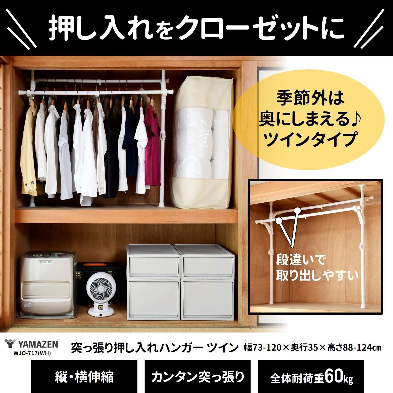 山善(YAMAZEN) 押し入れ ハンガーラック 【全体耐荷重60㎏】 伸縮 (幅73-120×奥行35×高さ88-124㎝) 突っ張り ワンタッチで設置可能 組立品 ホワイト WJO-717(WH)