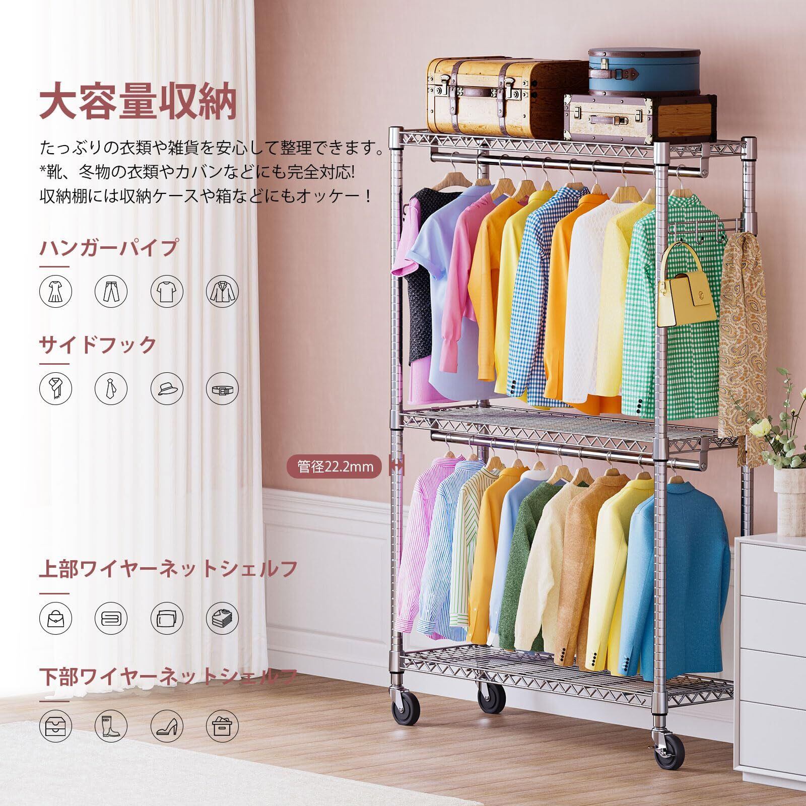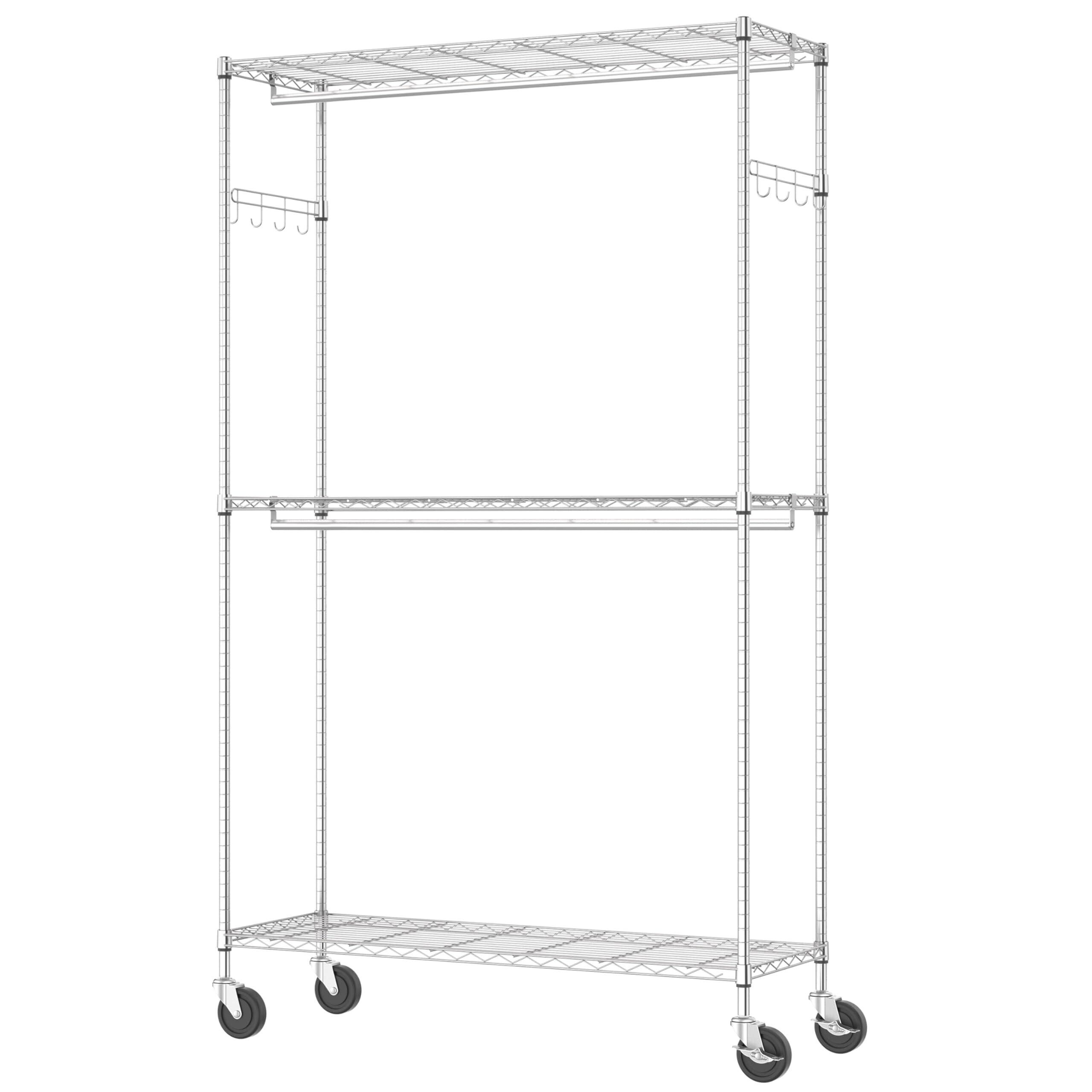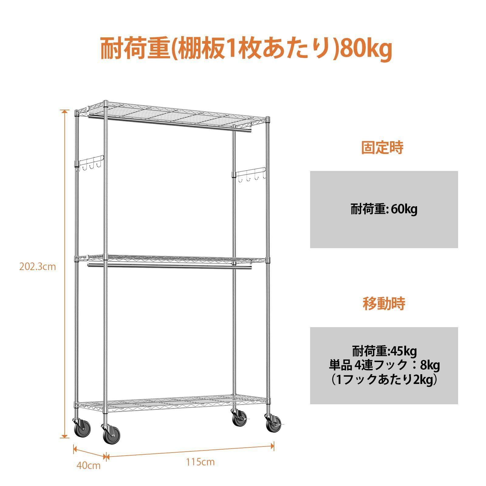 IZEUK ハンガーラック キャスター付き 棚付き 3段 押入れ ハンガーパイプ付き ガーメント 工具付属 突っ張りポールハンガー ダブル 収納 高耐荷重 耐久性 頑丈 ワイヤー衣類ラック 金属製自立式 防錆 クローゼットワードローブ 車輪付/4個アジャスター付属 幅115×奥行40×高さ202cm(車輪を含む高さ) 管径22.2mm クロムメッキ