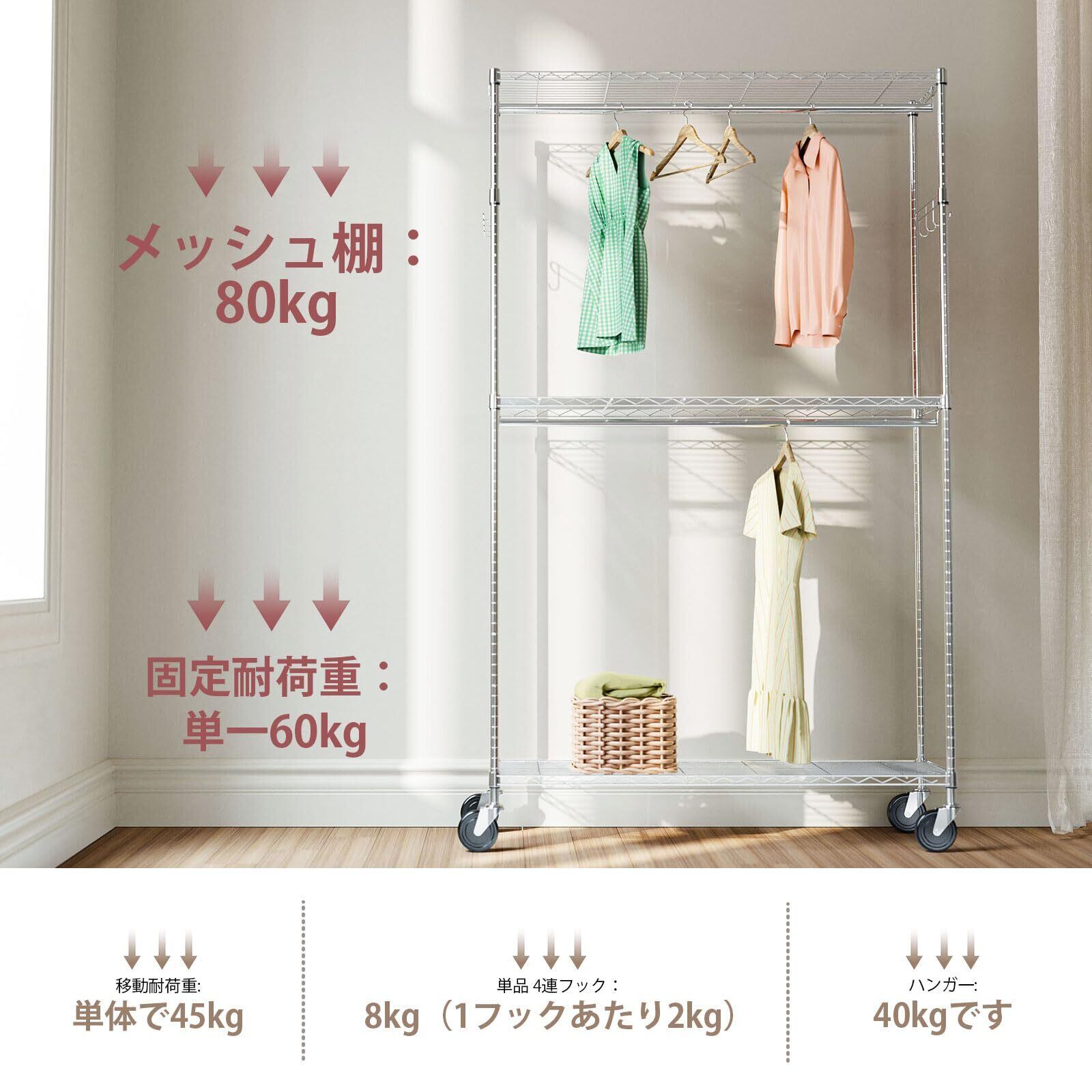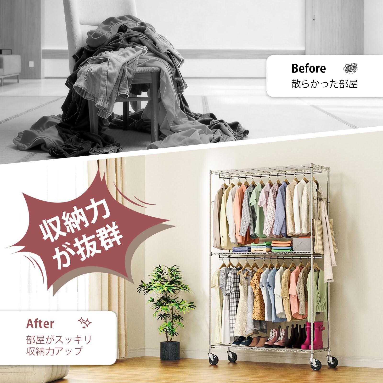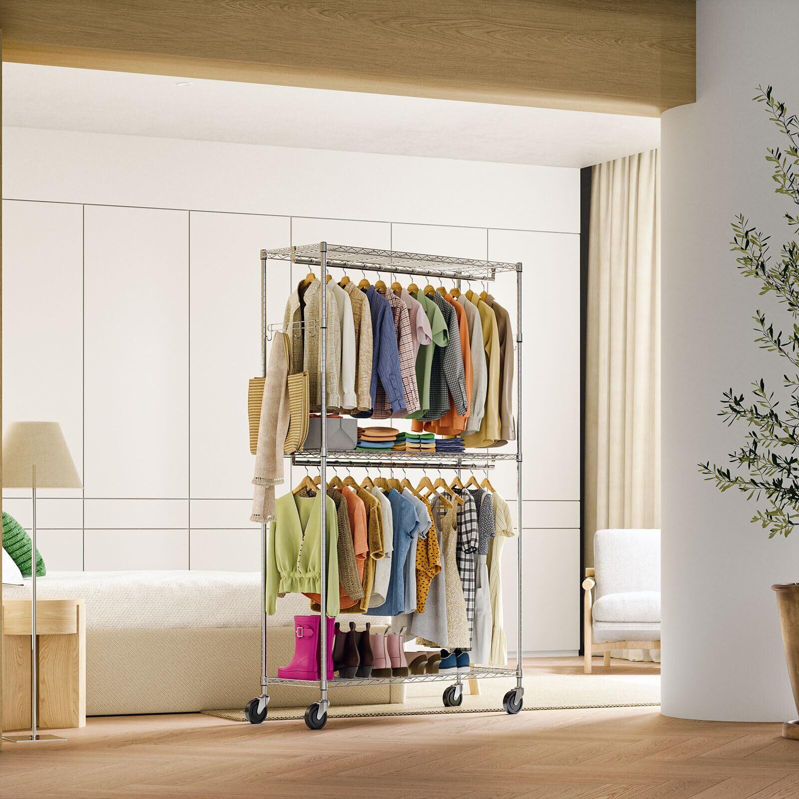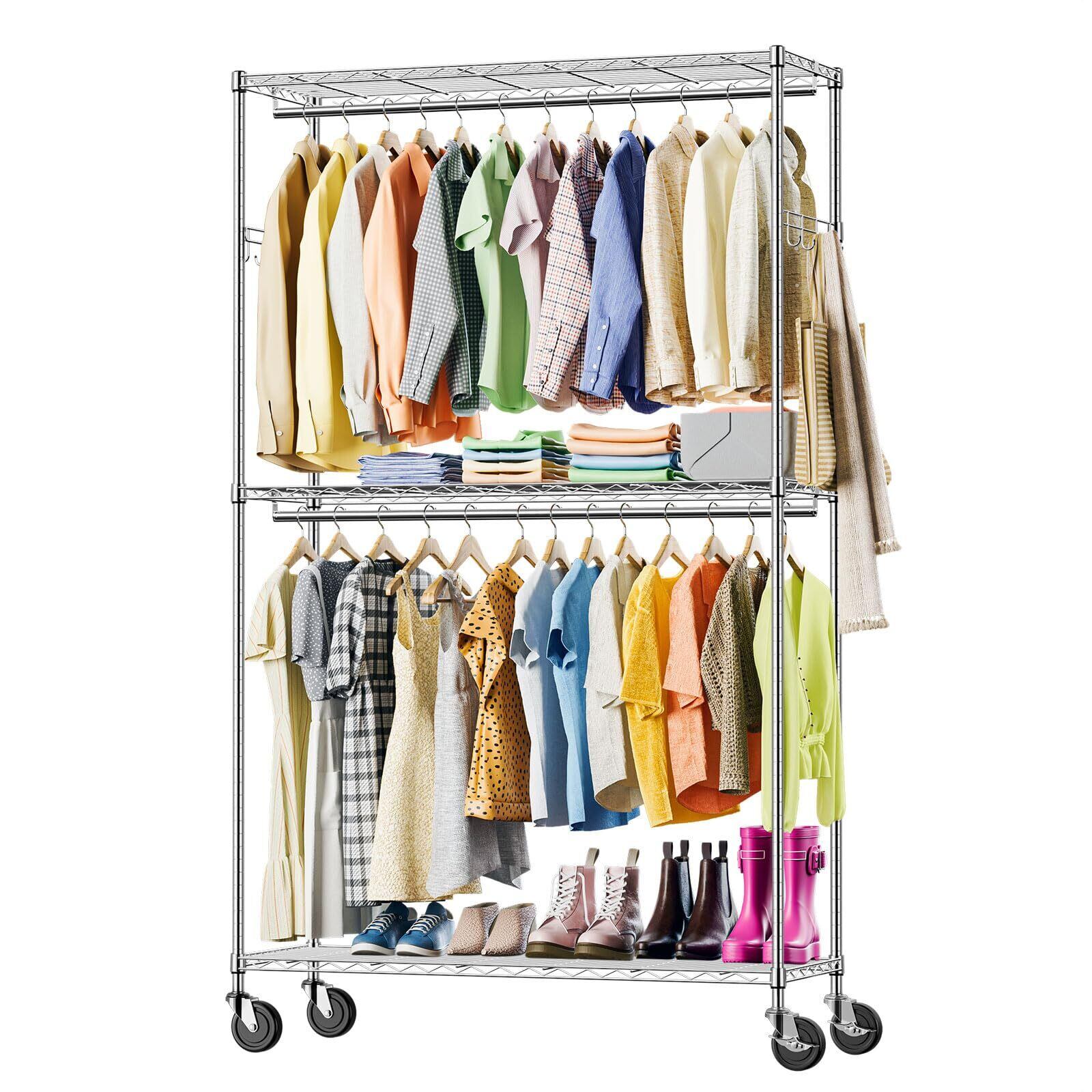 IZEUK ハンガーラック キャスター付き 棚付き 3段 押入れ ハンガーパイプ付き ガーメント 工具付属 突っ張りポールハンガー ダブル 収納 高耐荷重 耐久性 頑丈 ワイヤー衣類ラック 金属製自立式 防錆 クローゼットワードローブ 車輪付/4個アジャスター付属 幅115×奥行40×高さ202cm(車輪を含む高さ) 管径22.2mm クロムメッキ