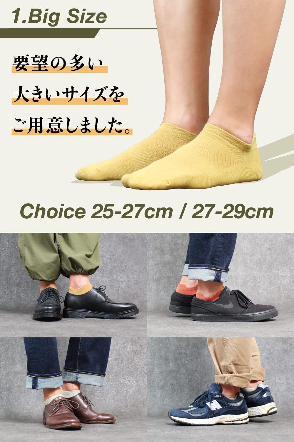 【2サイズの踝ソックス】25、26、27cmの普通サイズと、27、28、29cmの大きいサイズの2サイズをご用意しています。28cm、29cmのおおきいサイズのくるぶし丈のスニーカーソックスをお探しの方にオススメです。