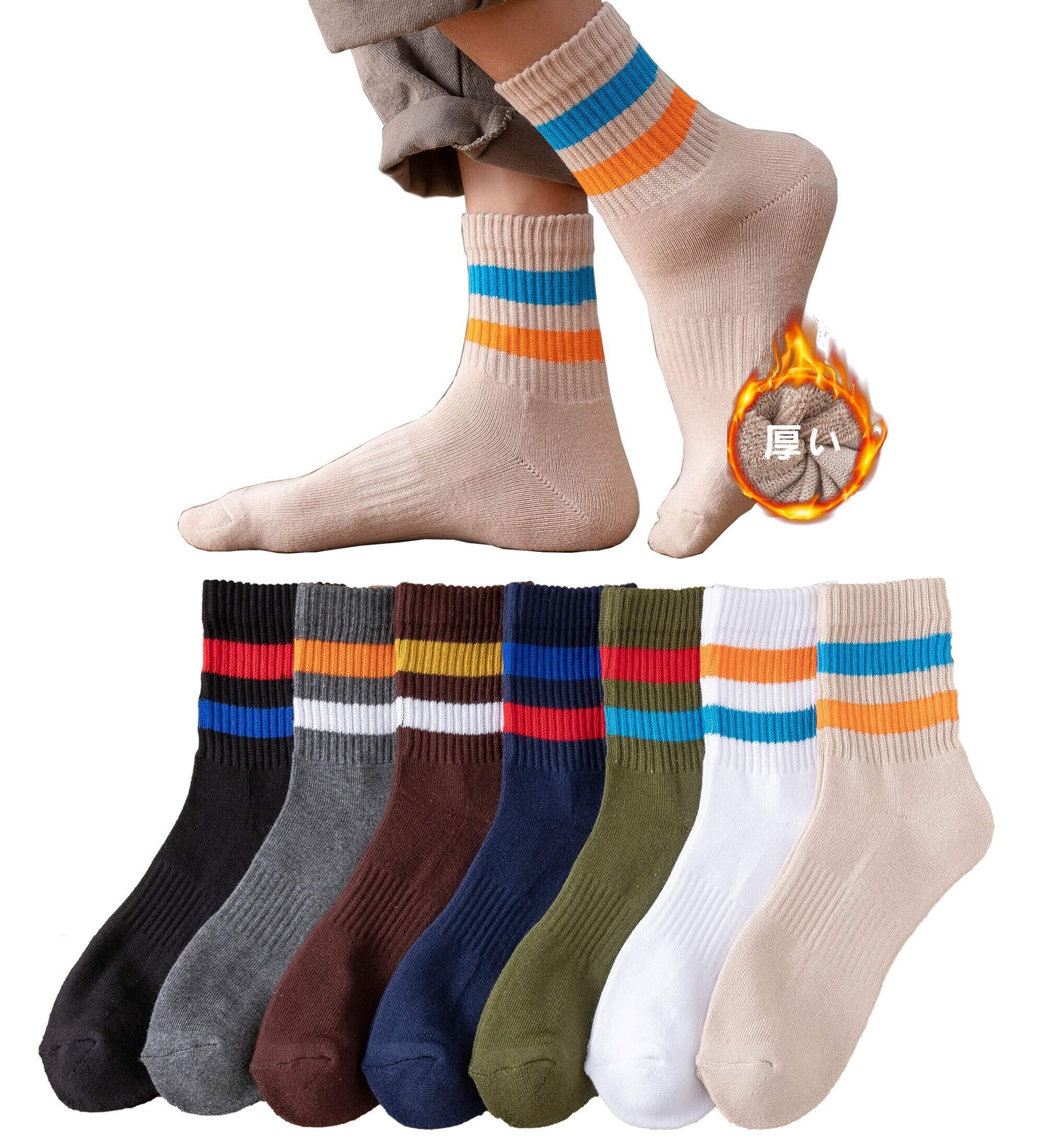 【極厚裏パイル】7足7色セット春冬秋に活躍。やわらかタッチで、肌触りが気持ちいい裏起毛素材なので、足元をやさしくつつみこみ、冷えからしっかり守ります。豊富な色とシンプルなデザインは流行を追う若者にも人気な春秋冬用おしゃれクルーソックス メンズ。