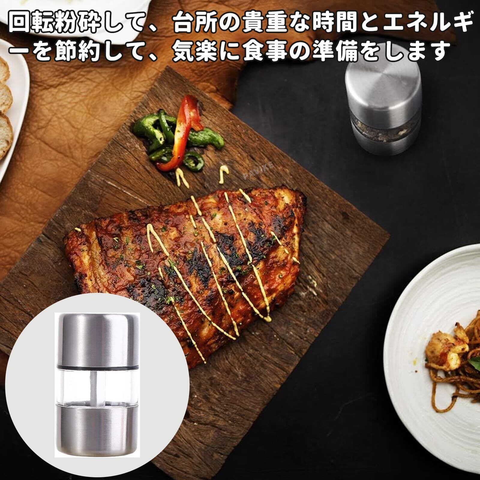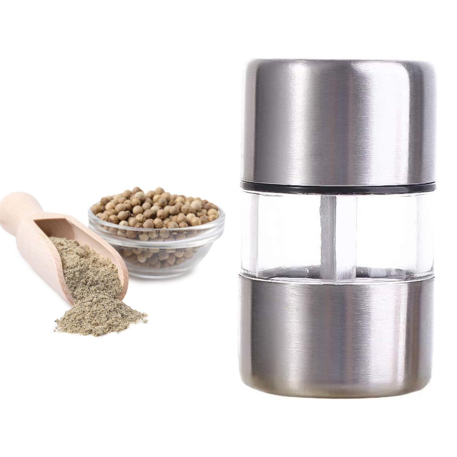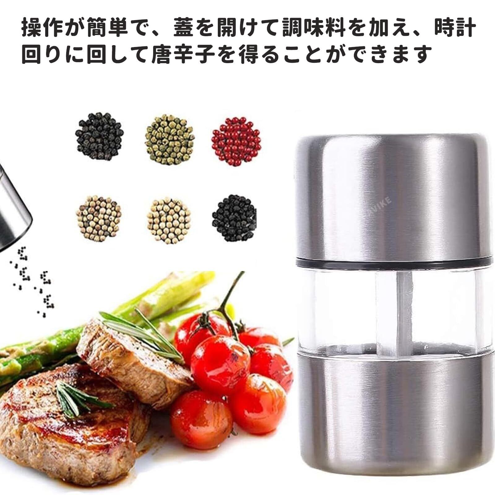 【製品仕様】サイズは約5*3*3cm、3gくらいの胡椒入れる可能です。ステンレス、アクリスとセラミックで作られ、質の良いペッパーミルです。ゴマ、岩塩、こしょう、山椒などに使用てきます。
